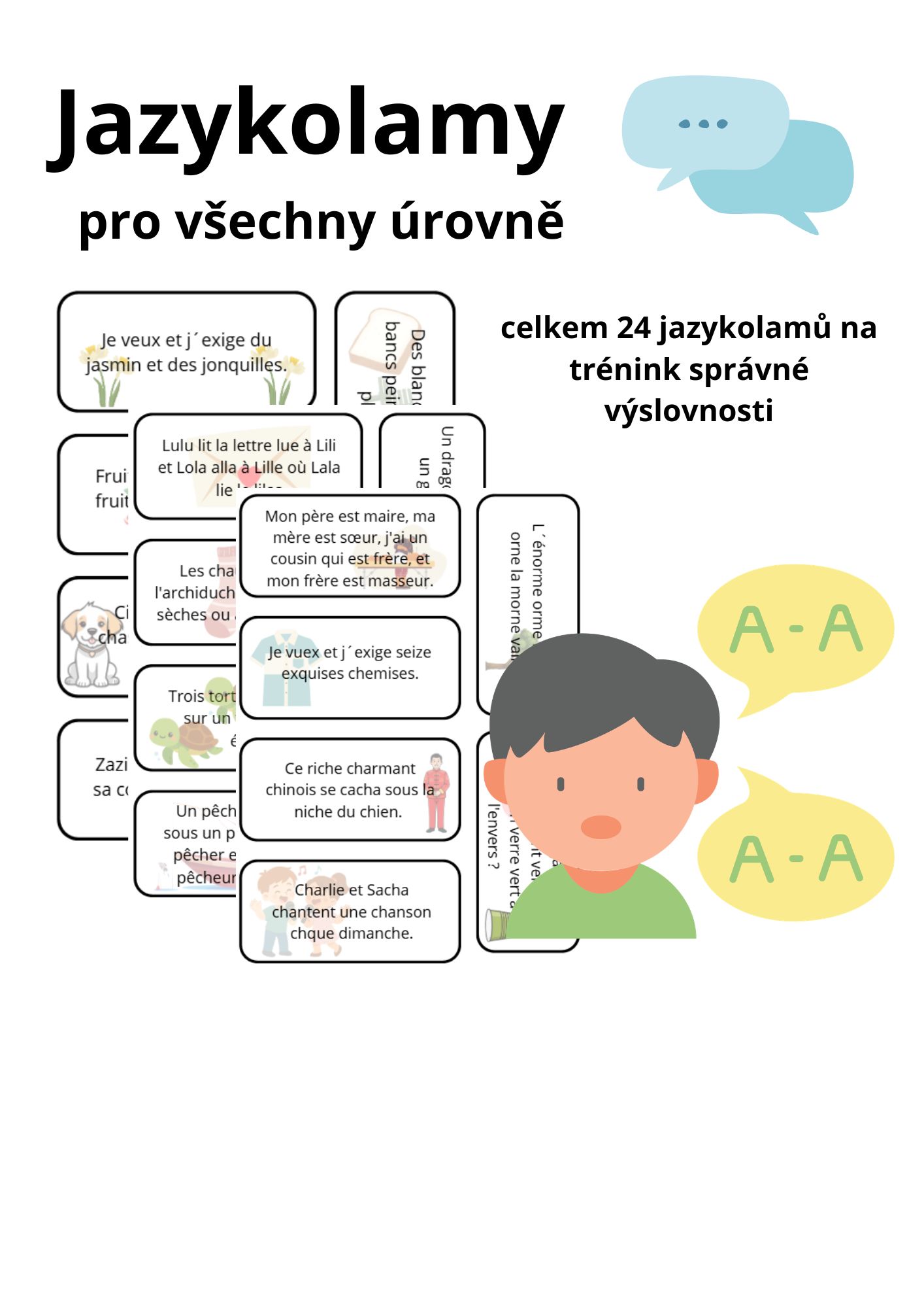 Texty jsou krátké, rytmické a graficky přehledně zpracované. Obsahují opakování podobných slabik, aliterace a hru se zvukovou podobností slov, čímž rozvíjejí výslovnost, plynulost řeči i fonologické uvědomění. Materiál je vhodný pro motivační fonetické rozcvičky, práci s rytmem jazyka i hravé upevňování výslovnosti na úrovni A0–B1. Obsahuje celkem 24 jazykolamů.