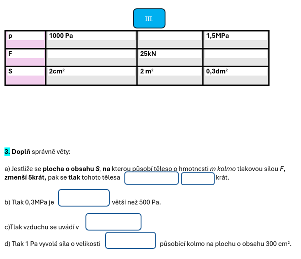- Práce s jednotkami (Pa, kPa, MPa, N, cm², m², dm²).