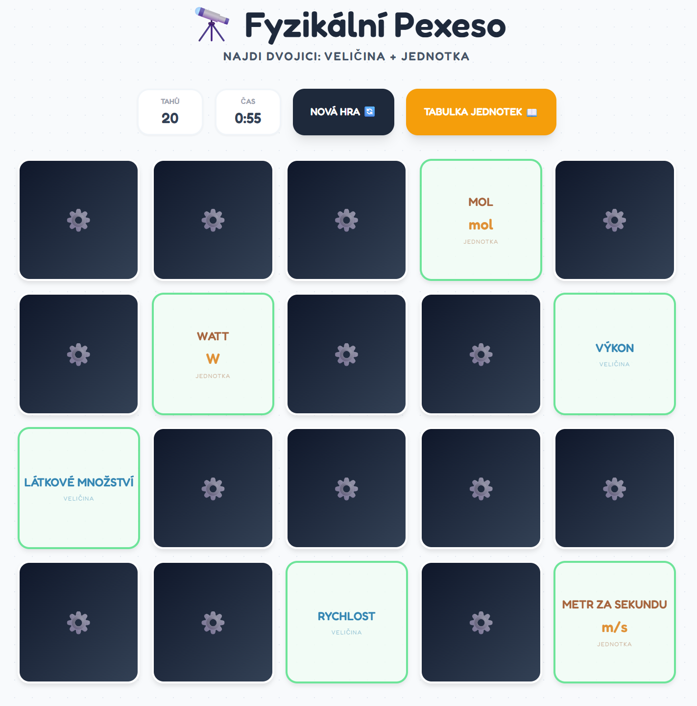 - Okamžitá zpětná vazba: Obsahuje zvukové efekty pro shodu i chybu a vizuální odlišení karet (veličina vs. jednotka).