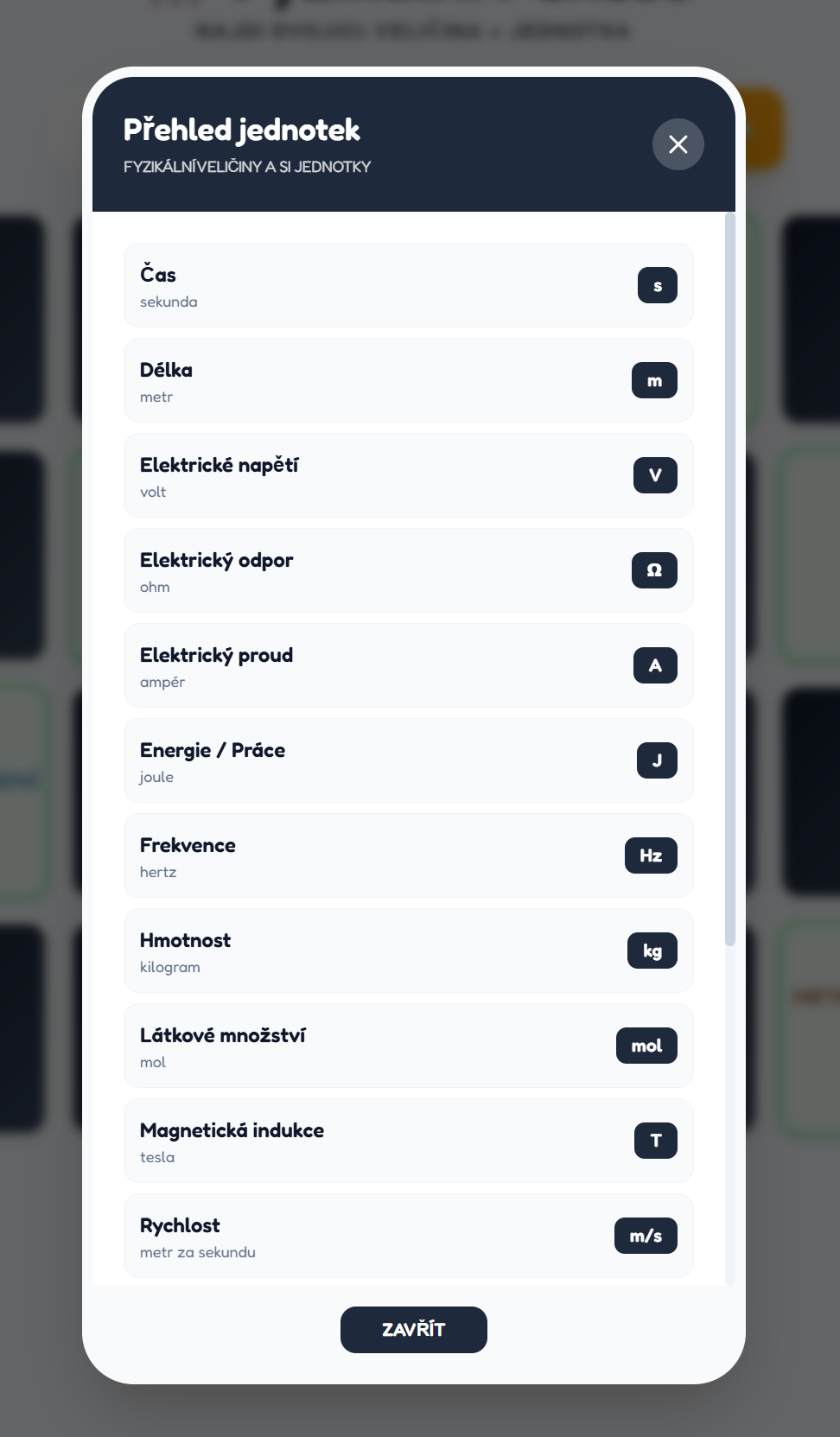 - Široký záběr: Hra náhodně vybírá 10 dvojic z celkového poolu 16 veličin (základní i odvozené jednotky SI).
