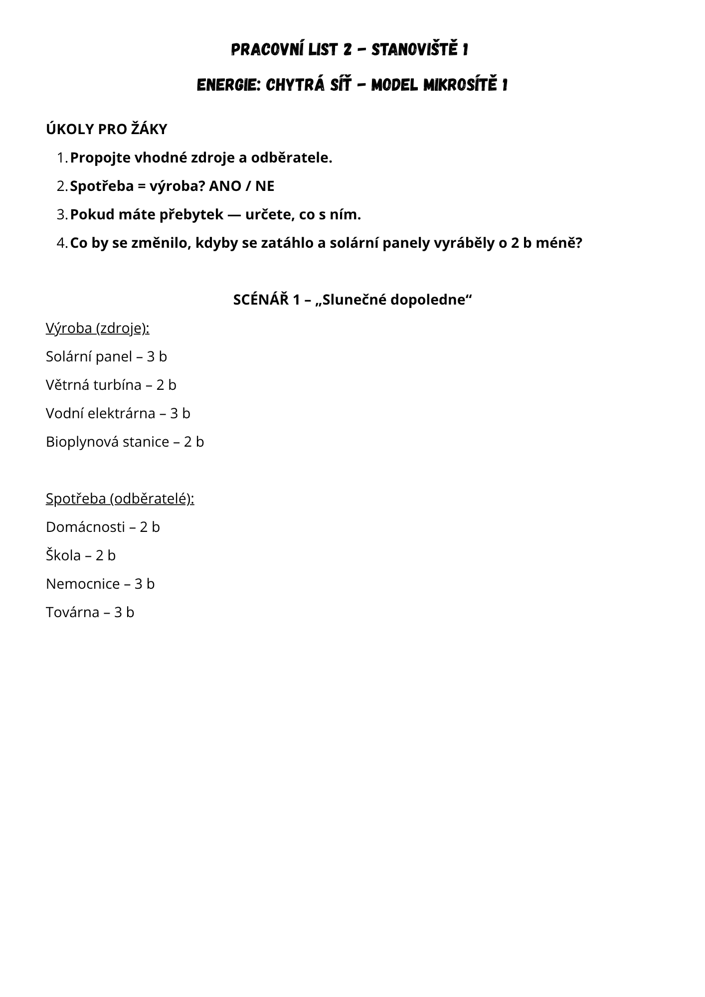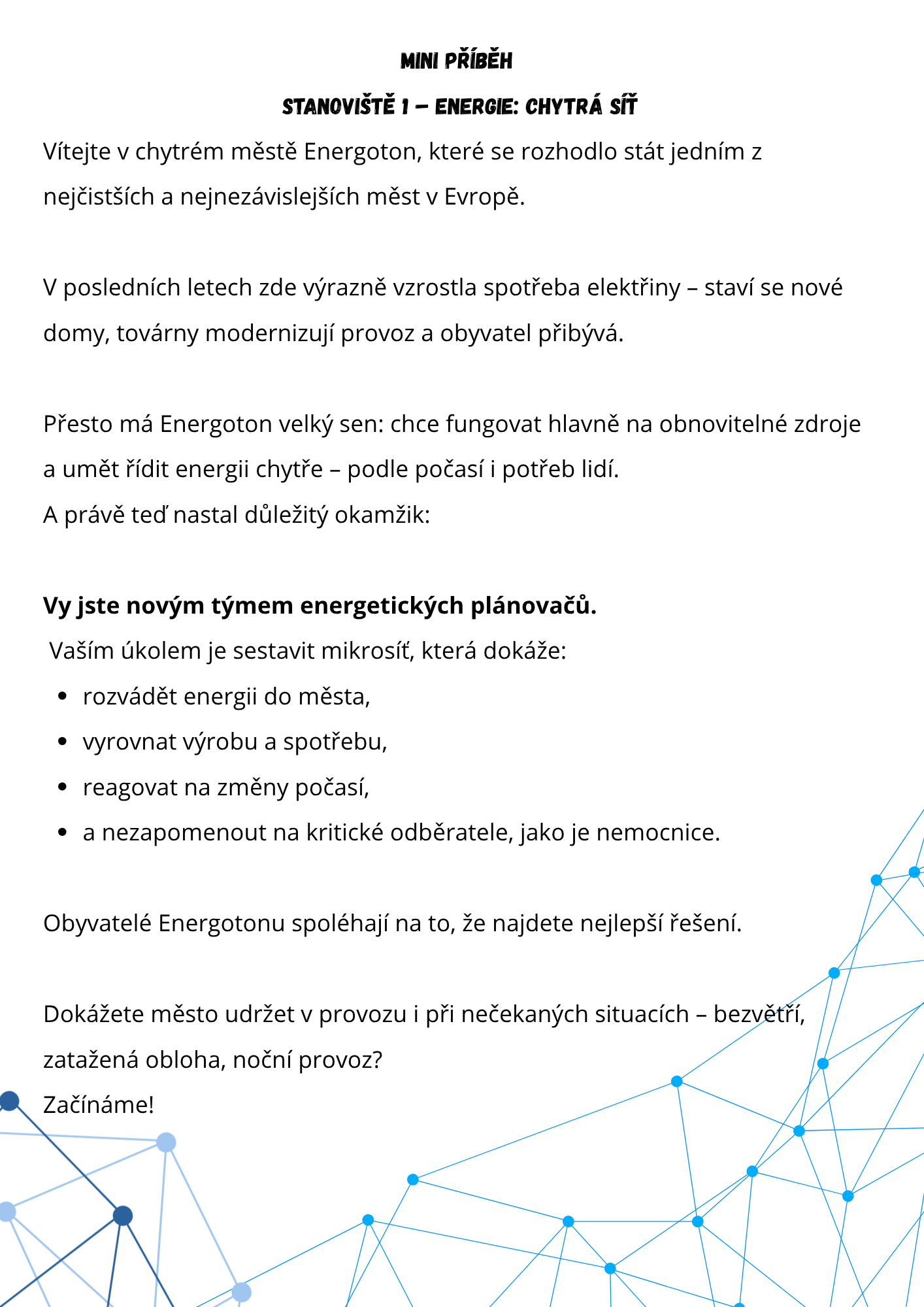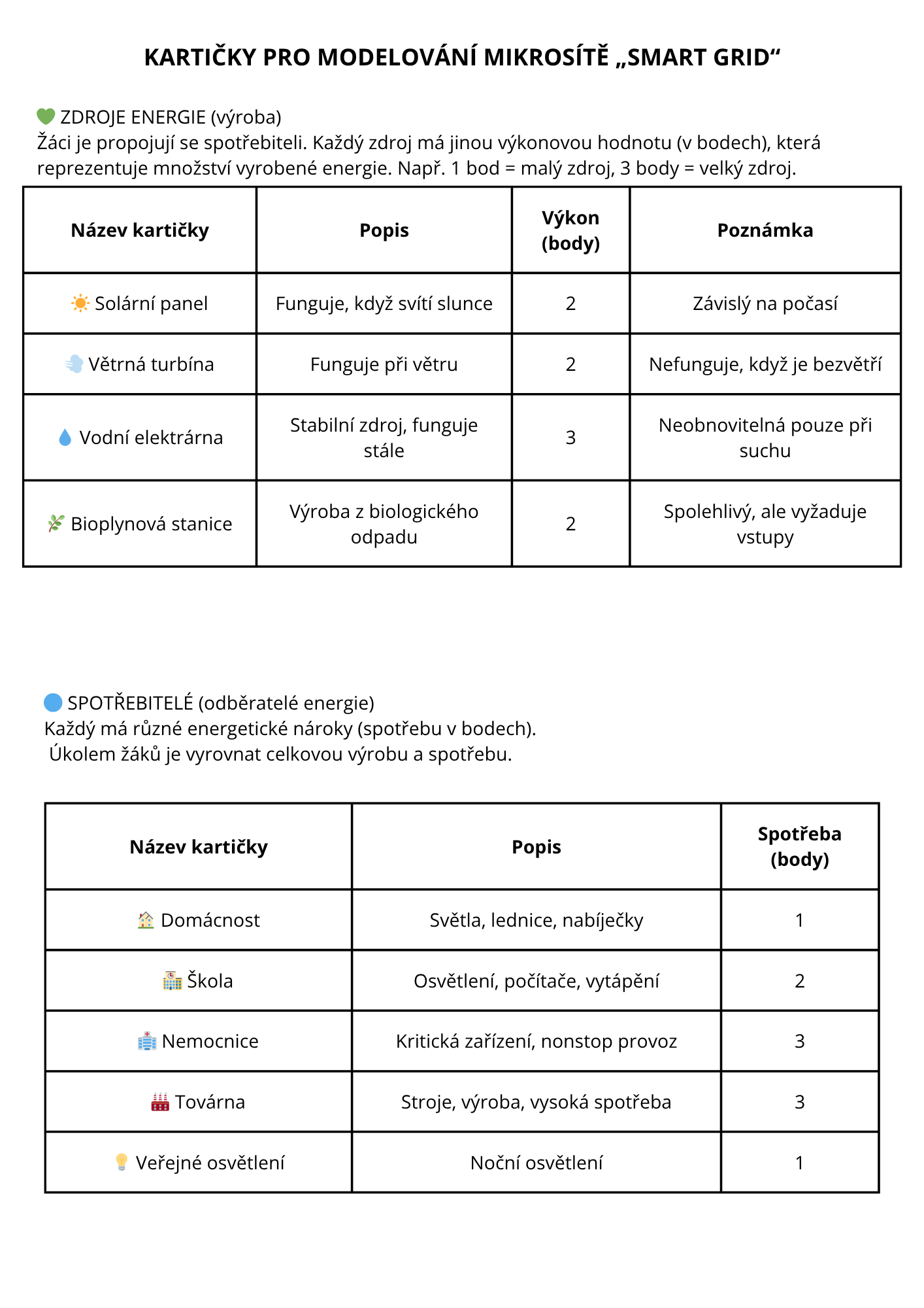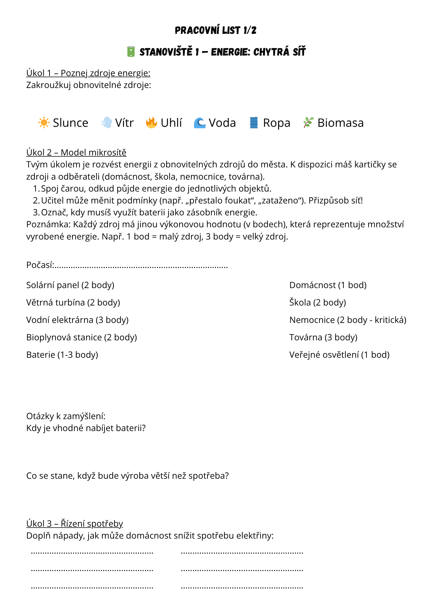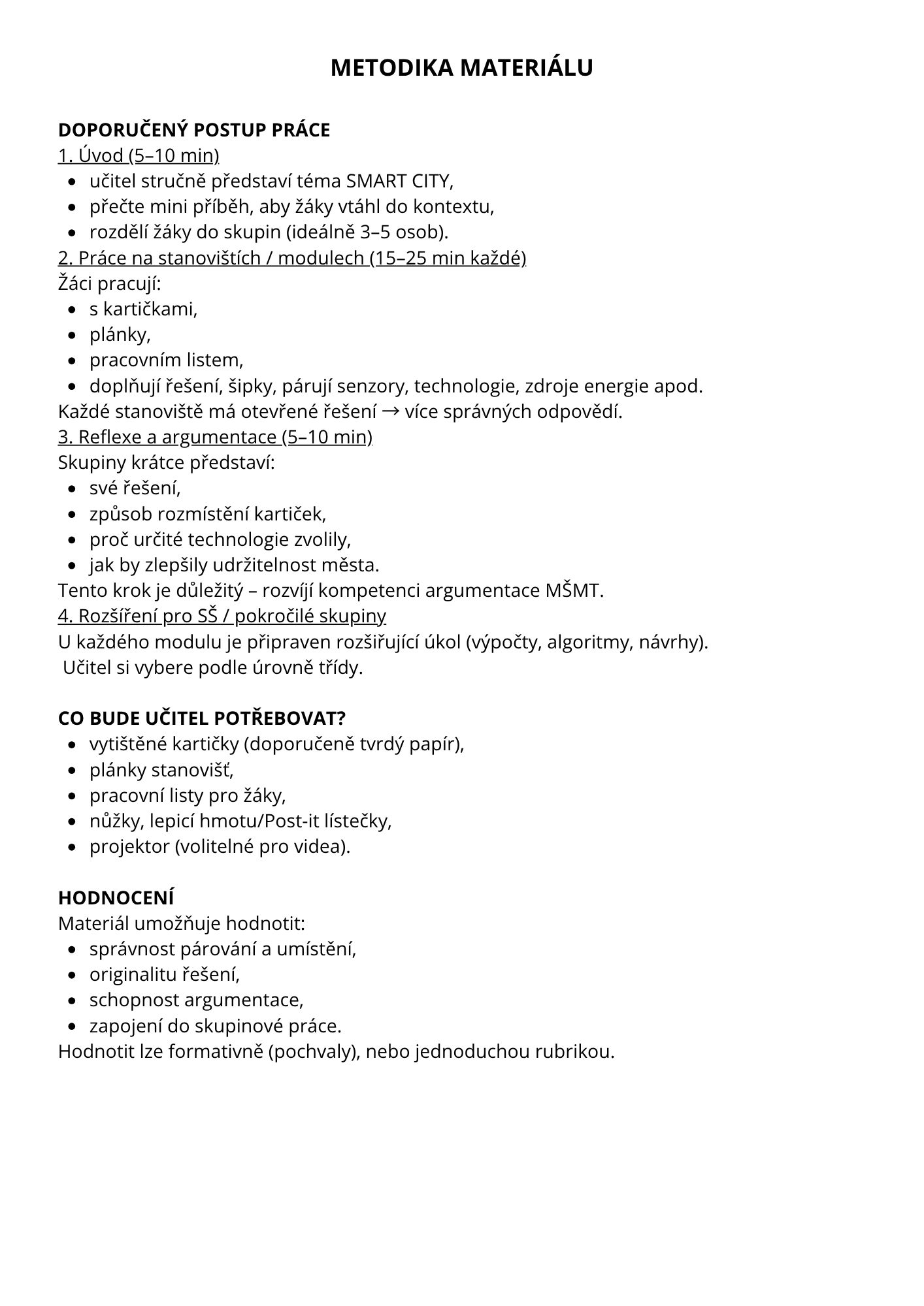 Žáci pracují s kartičkami, plánky stanovišť, scénáři a úkoly, díky nimž propojují poznatky z fyziky, informatiky, polytechniky a environmentální výchovy. Součástí jsou také pracovní listy pro žáky a metodické listy pro učitele. Materiál je vhodný pro projektové dny, skupinovou práci, badatelské aktivity i běžnou výuku.