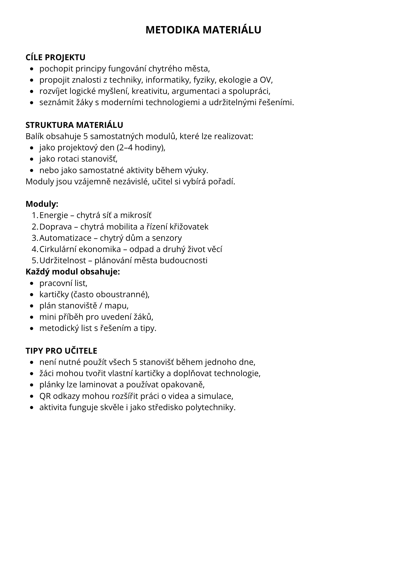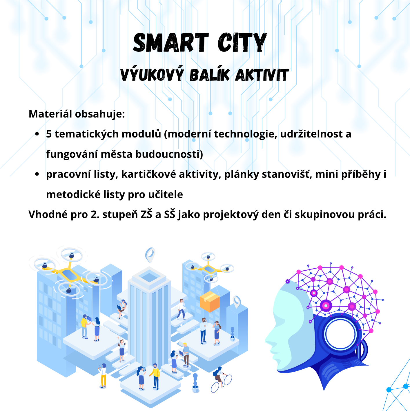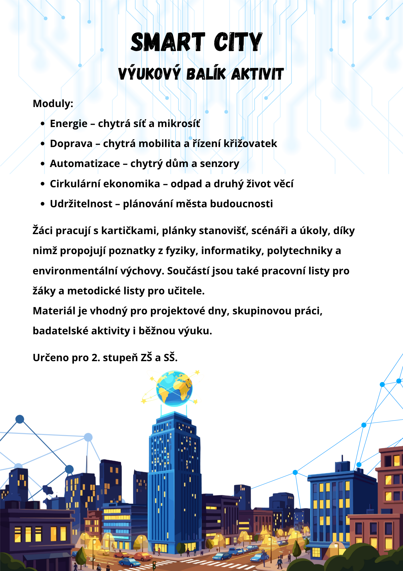 SMART CITY – výukový balík aktivit je komplexní, praktický a zábavný materiál, který provede žáky světem moderních technologií a města budoucnosti. Obsahuje pět tematických modulů: energie, doprava, automatizace, cirkulární ekonomika a udržitelné plánování.