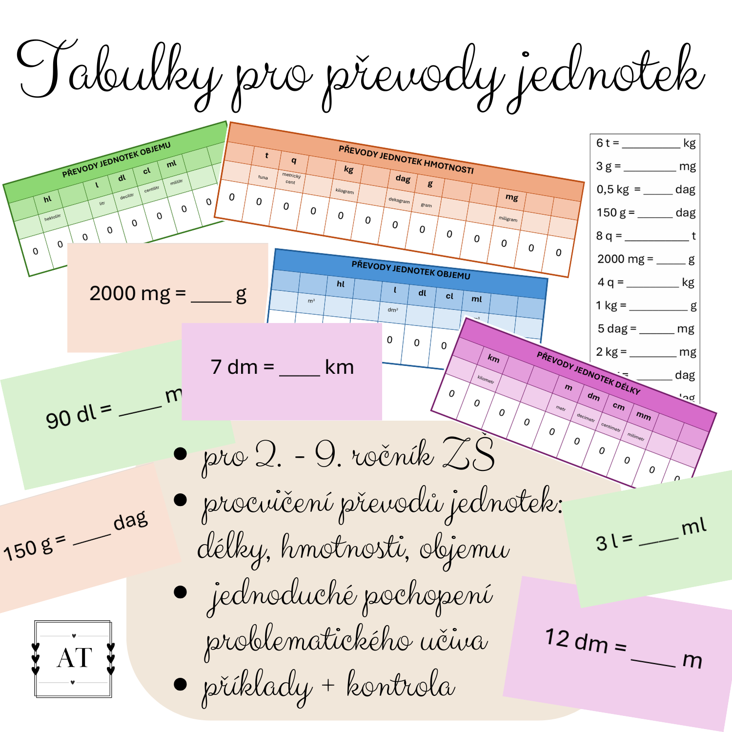 - 4 tabulky (1x délka, 1x hmotnost, 2x objem)
