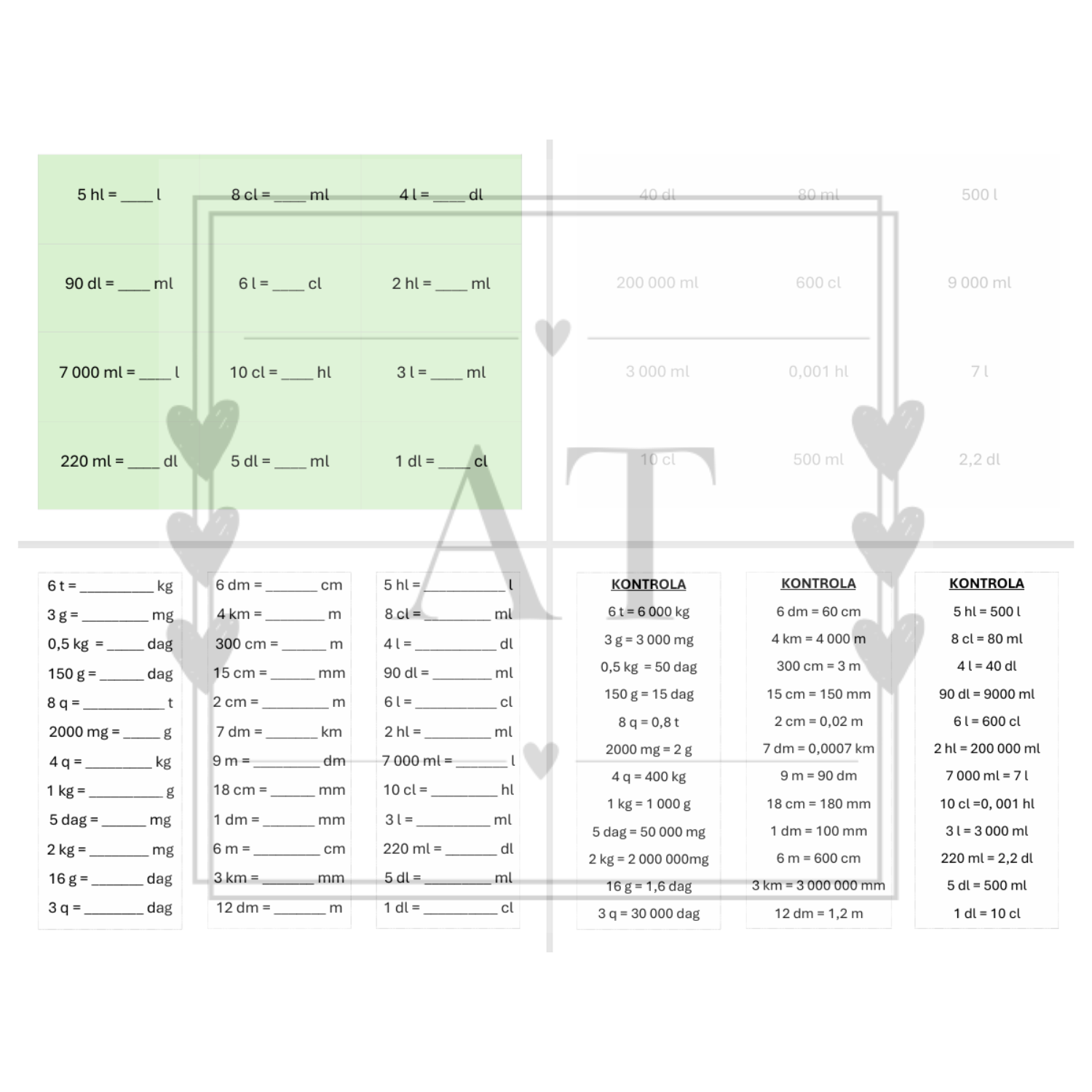 Tabulky určené k procvičení převádění jednotek objemu, hmotnosti a délky.