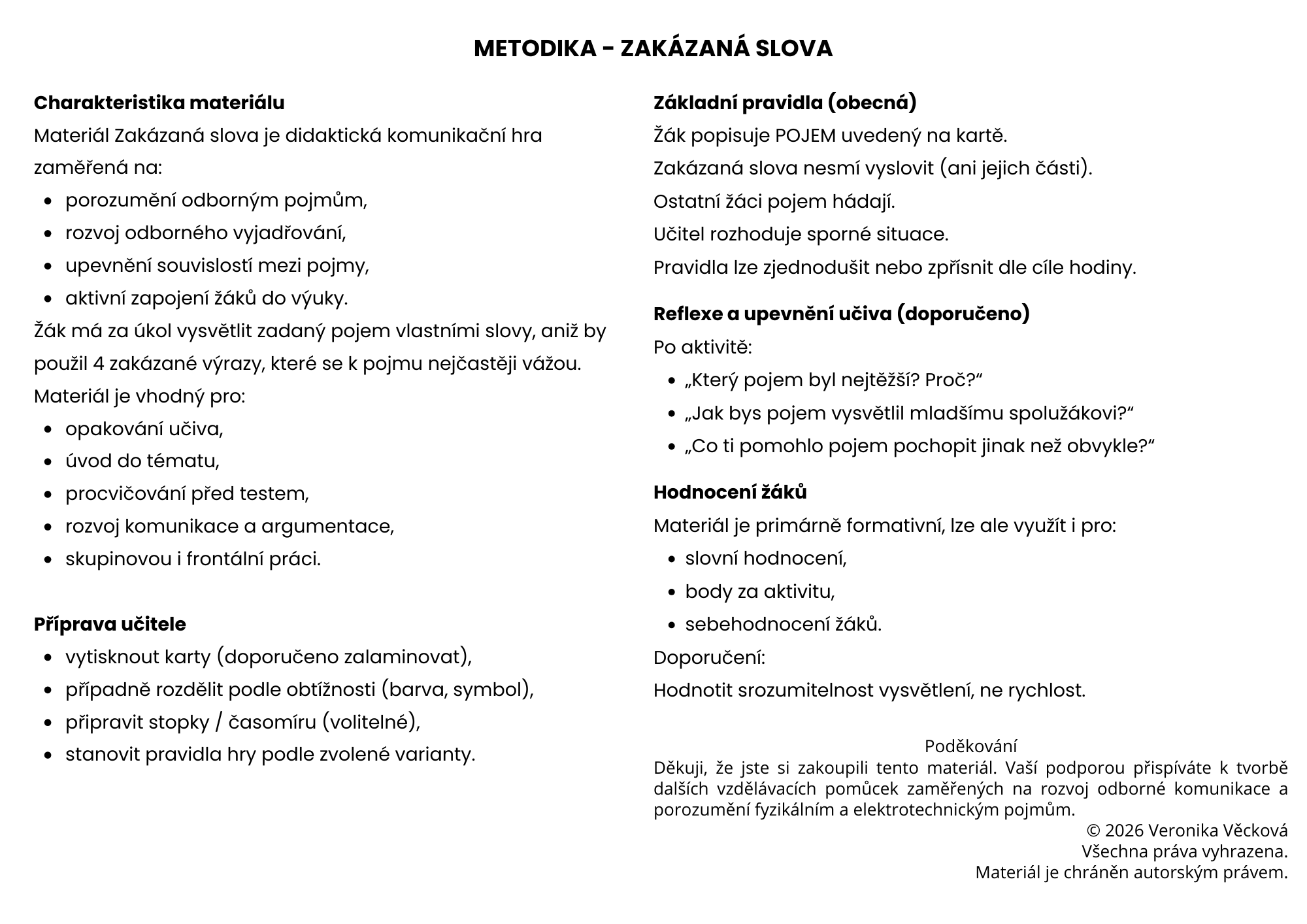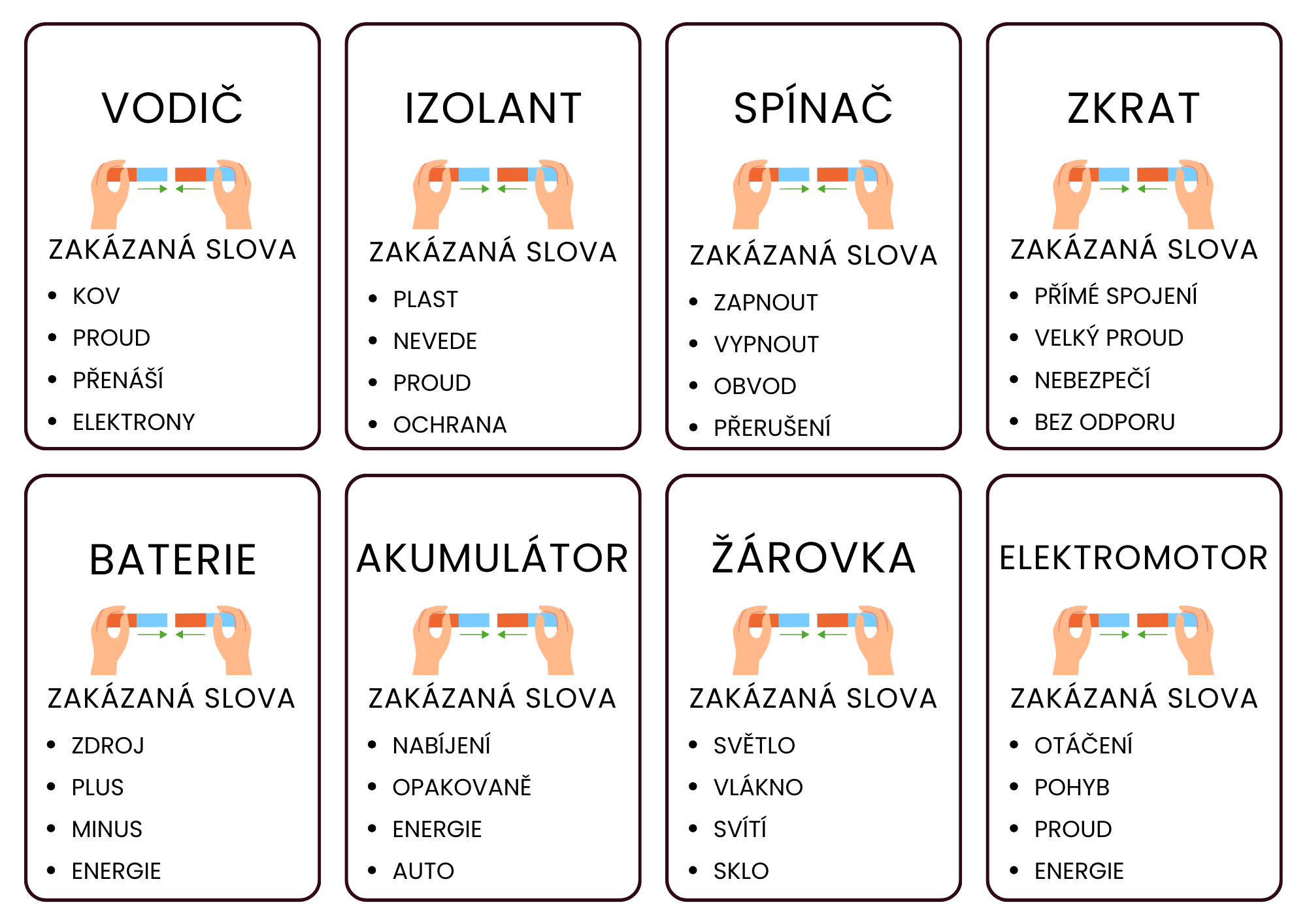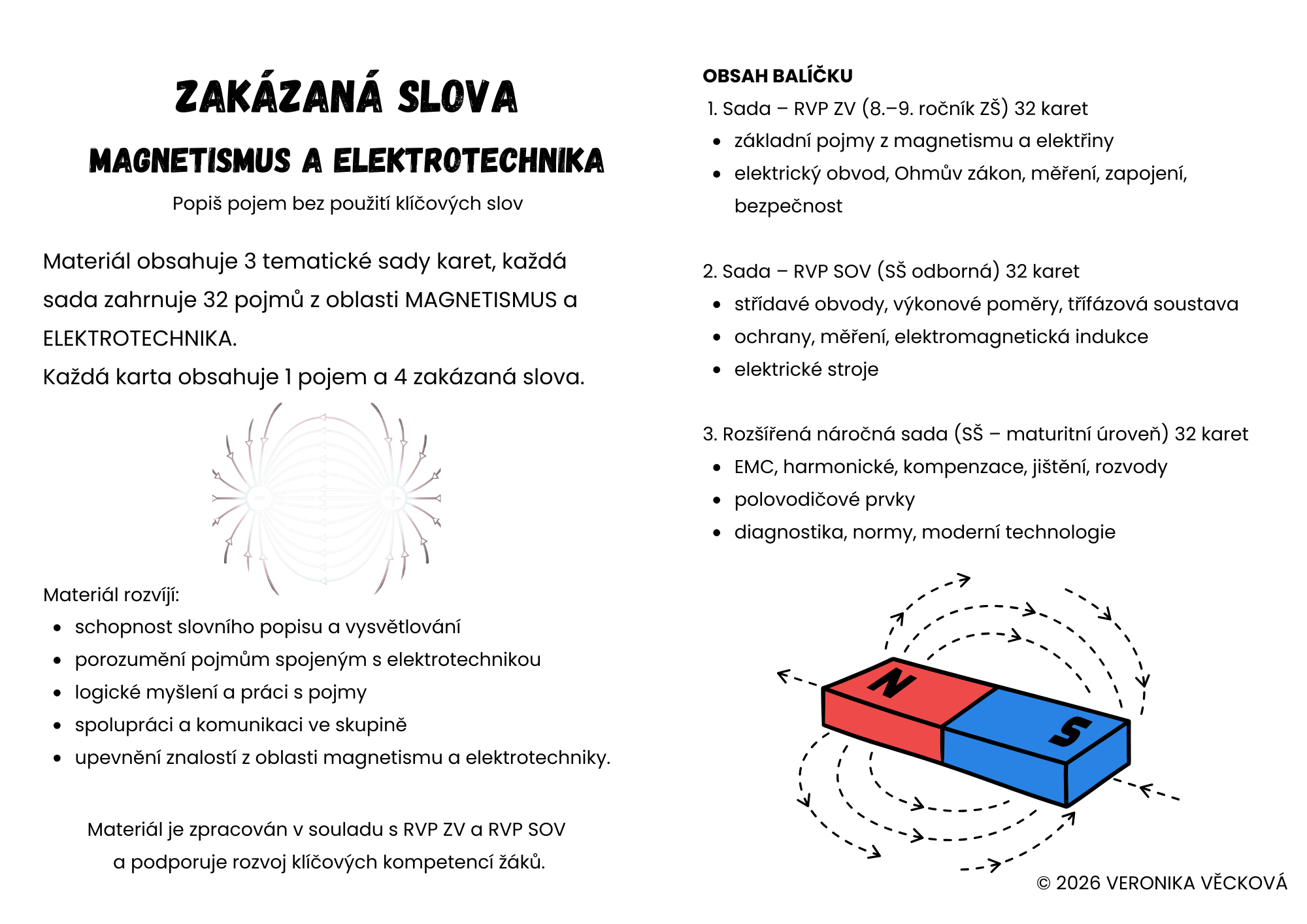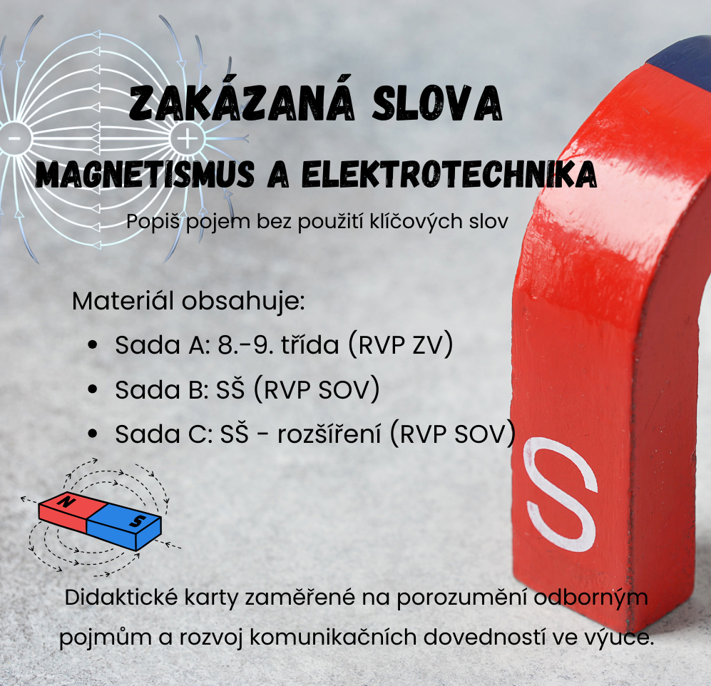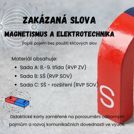 Zakázaná slova – Magnetismus a elektrotechnika je aktivizační výukový materiál určený pro výuku fyziky a odborných elektrotechnických předmětů. Soubor obsahuje tři úrovně obtížnosti – pro 2. stupeň ZŠ, odborné SŠ a rozšířenou variantu.