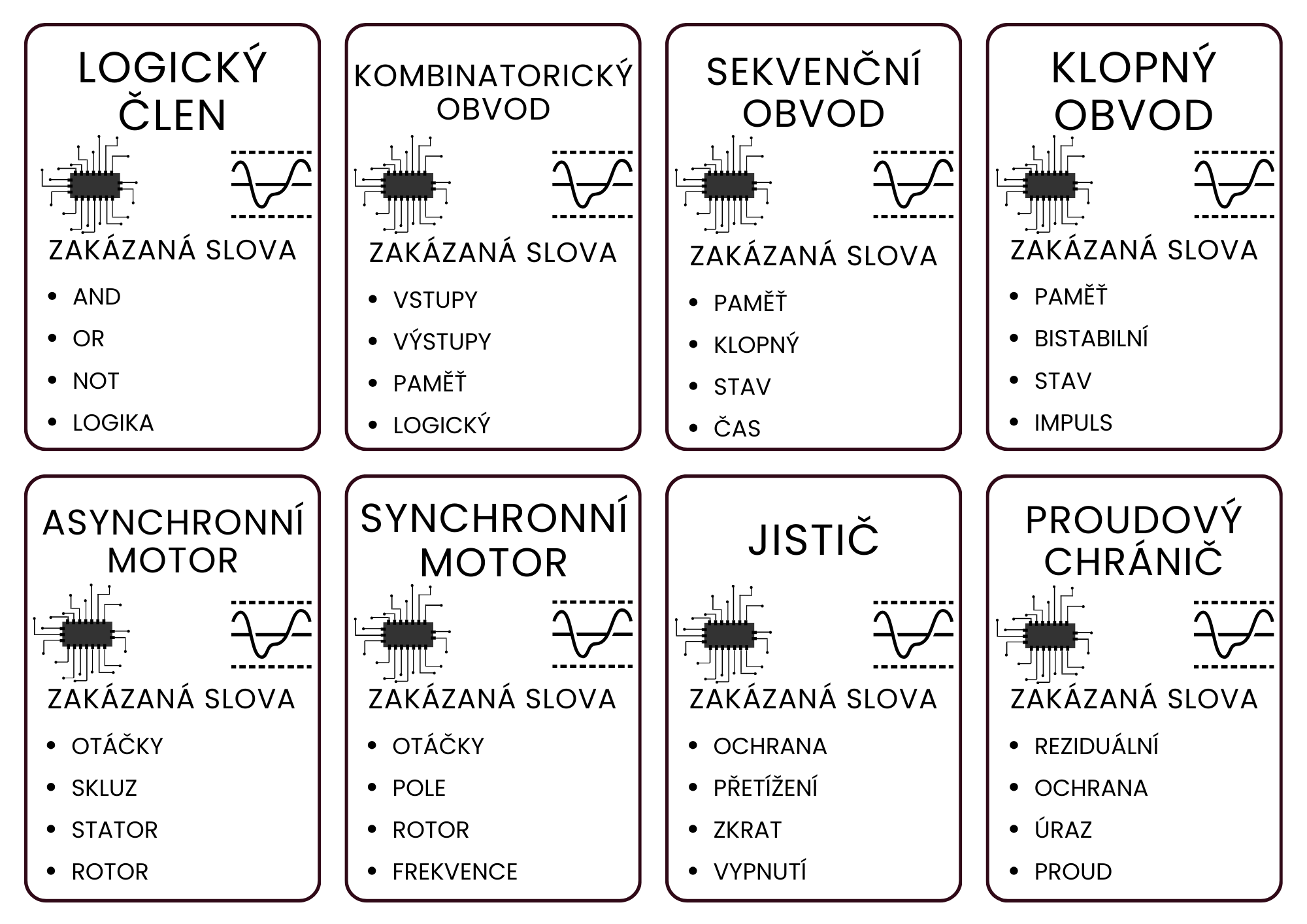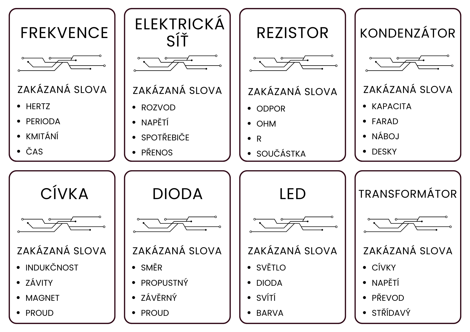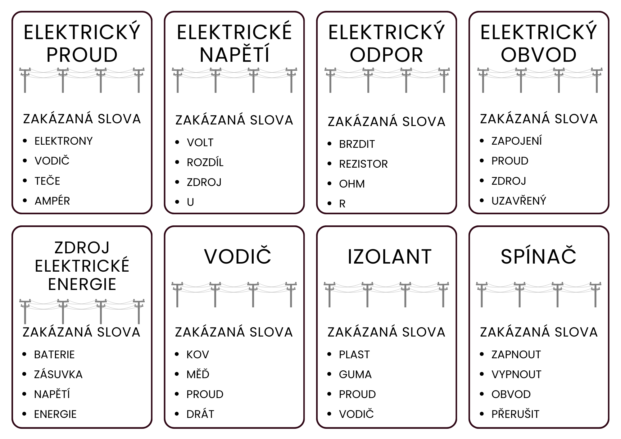 - Základní aktivita: Žák si vytáhne kartu s hlavním pojmem. Jeho úkolem je popsat tento pojem spolužákům tak, aby ho uhodli. Nesmí však při tom použít žádné ze 3–4 „zakázaných slov“ uvedených na kartě.