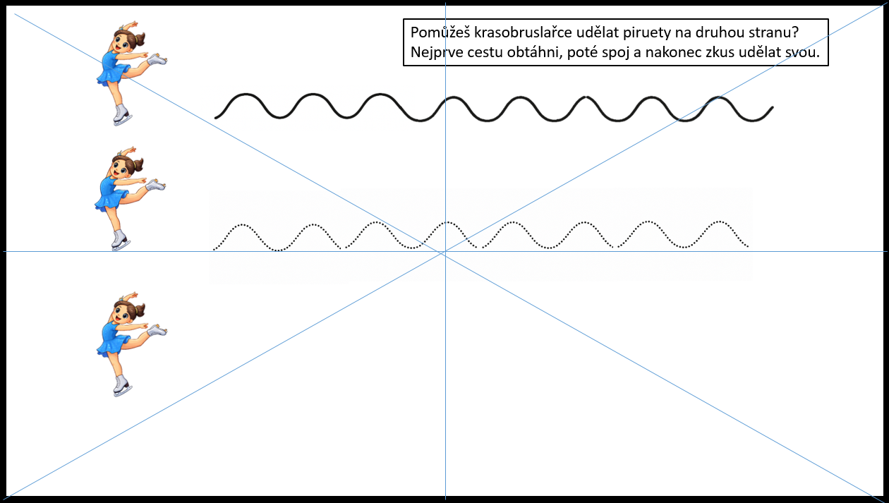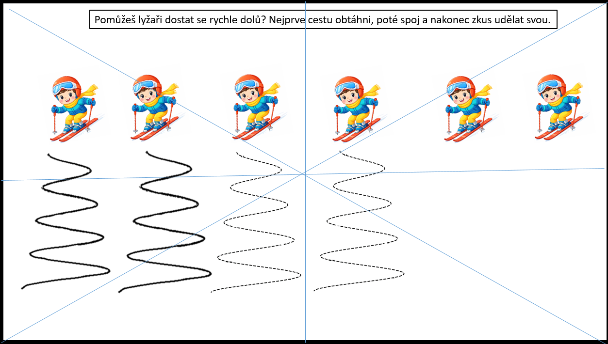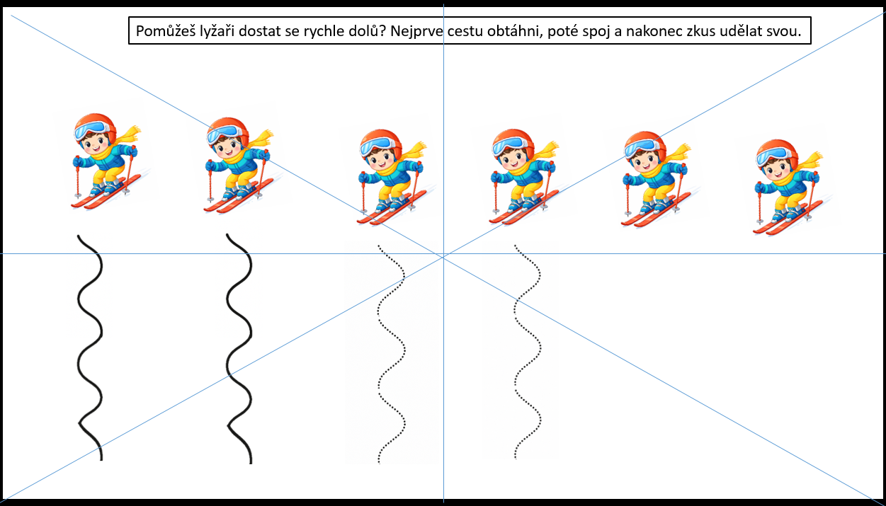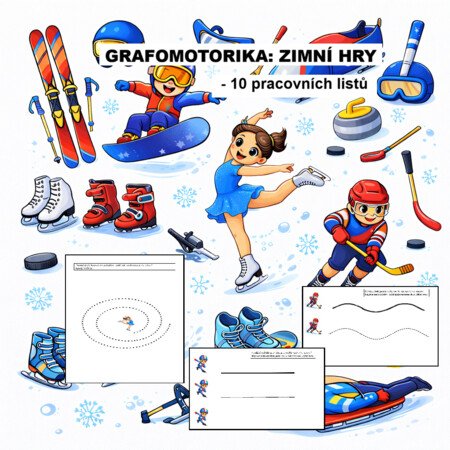 Každý list obsahuje jednu grafomotorickou úlohu s motivem zimních her a postupně náročnější linky.