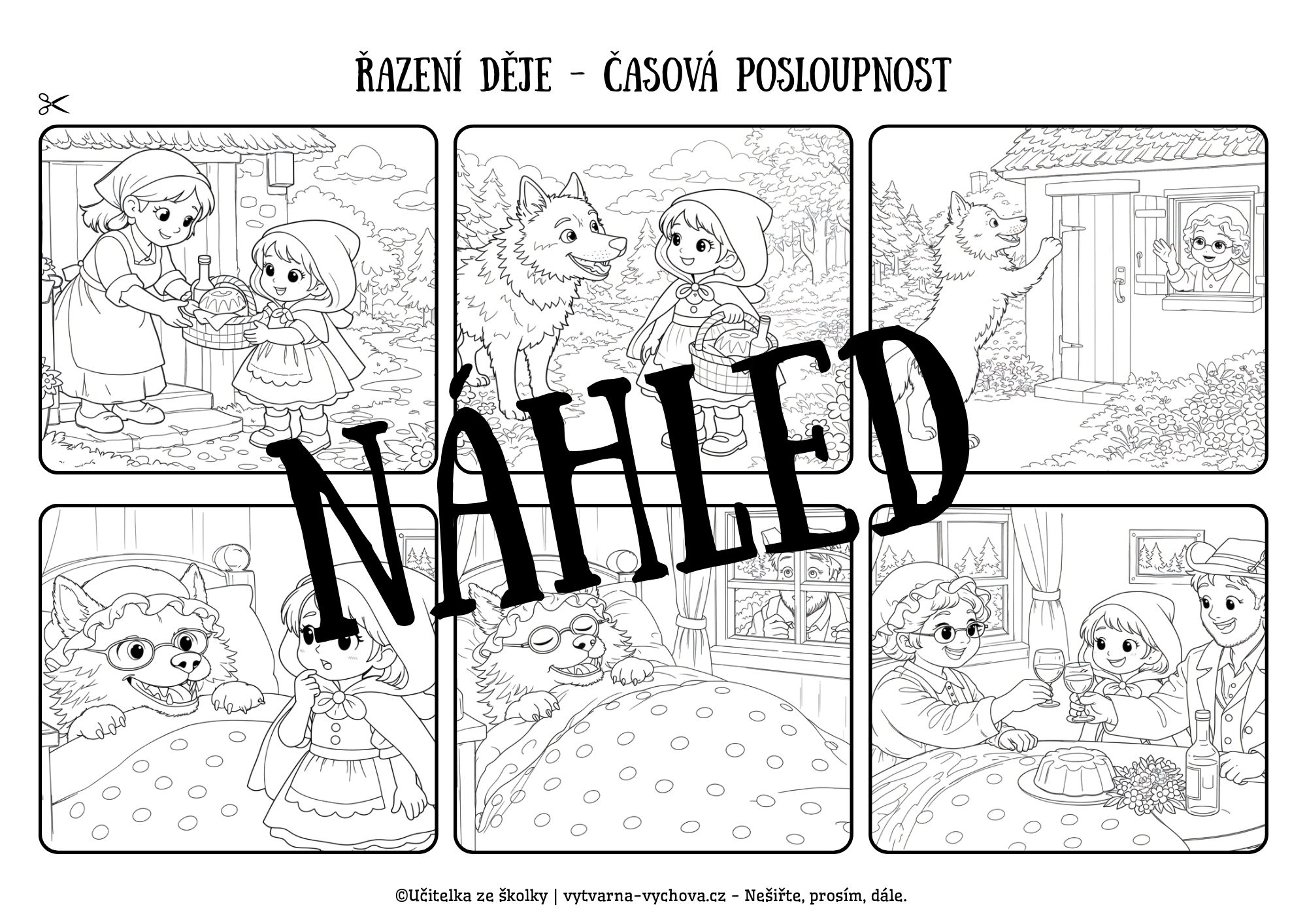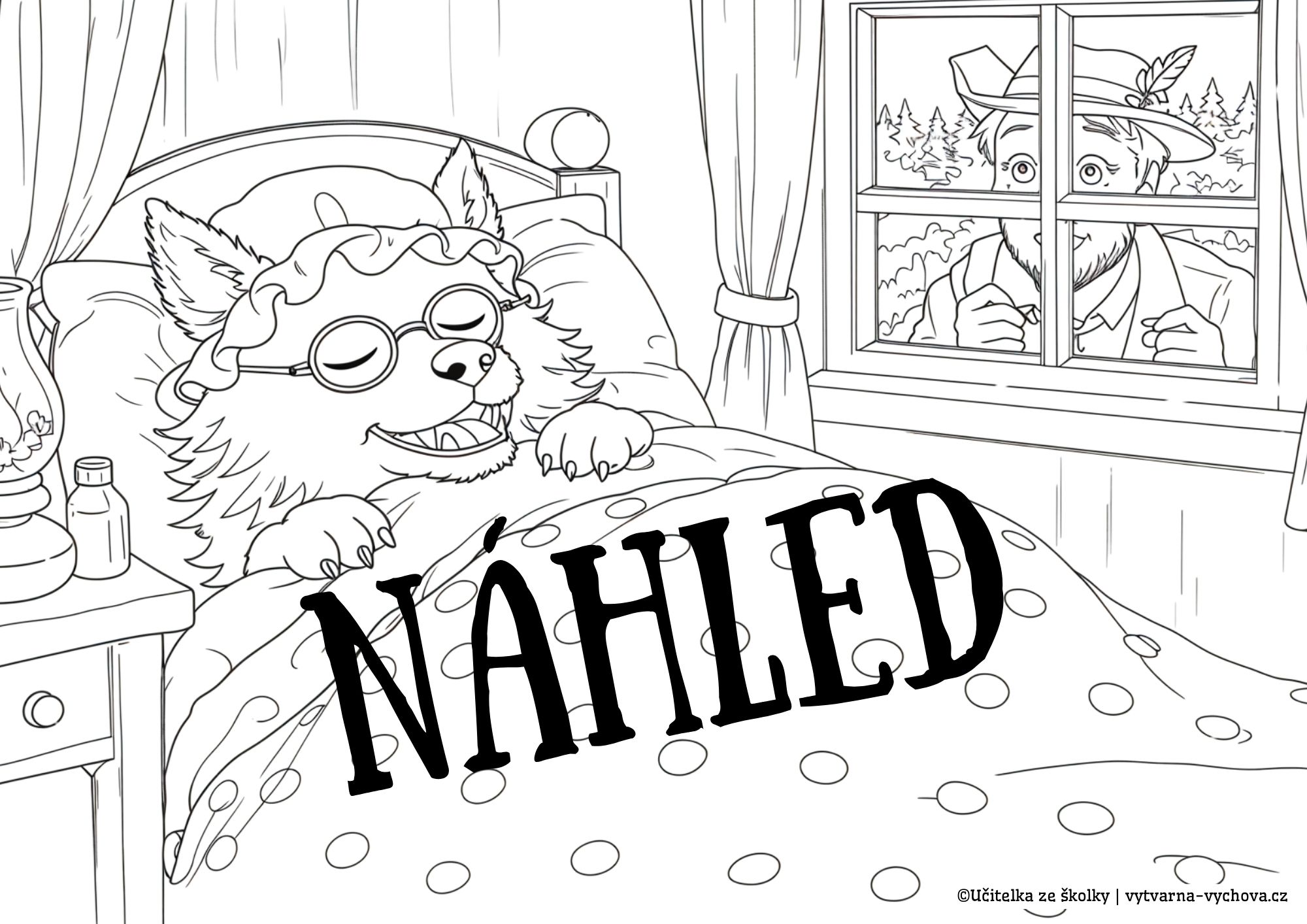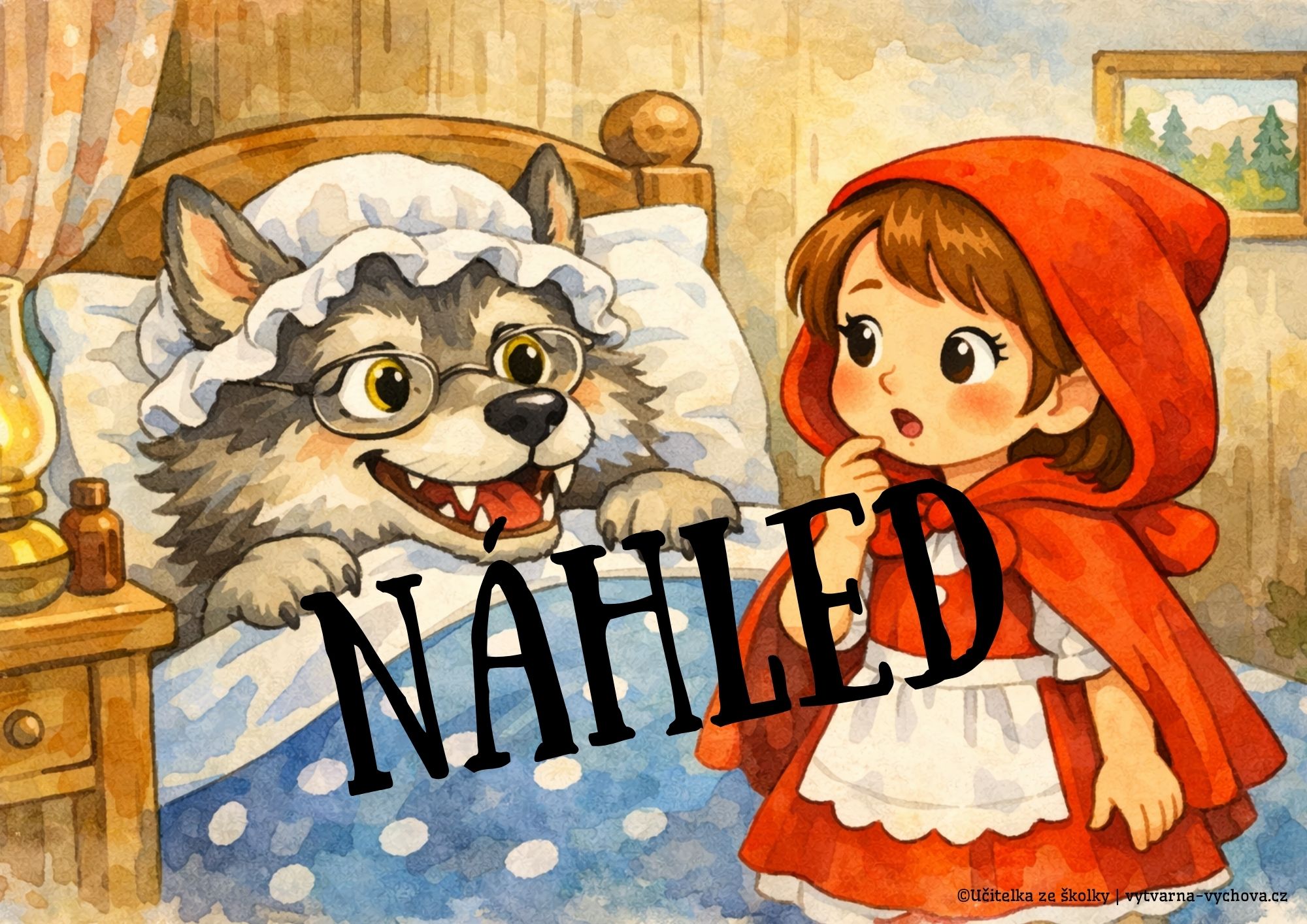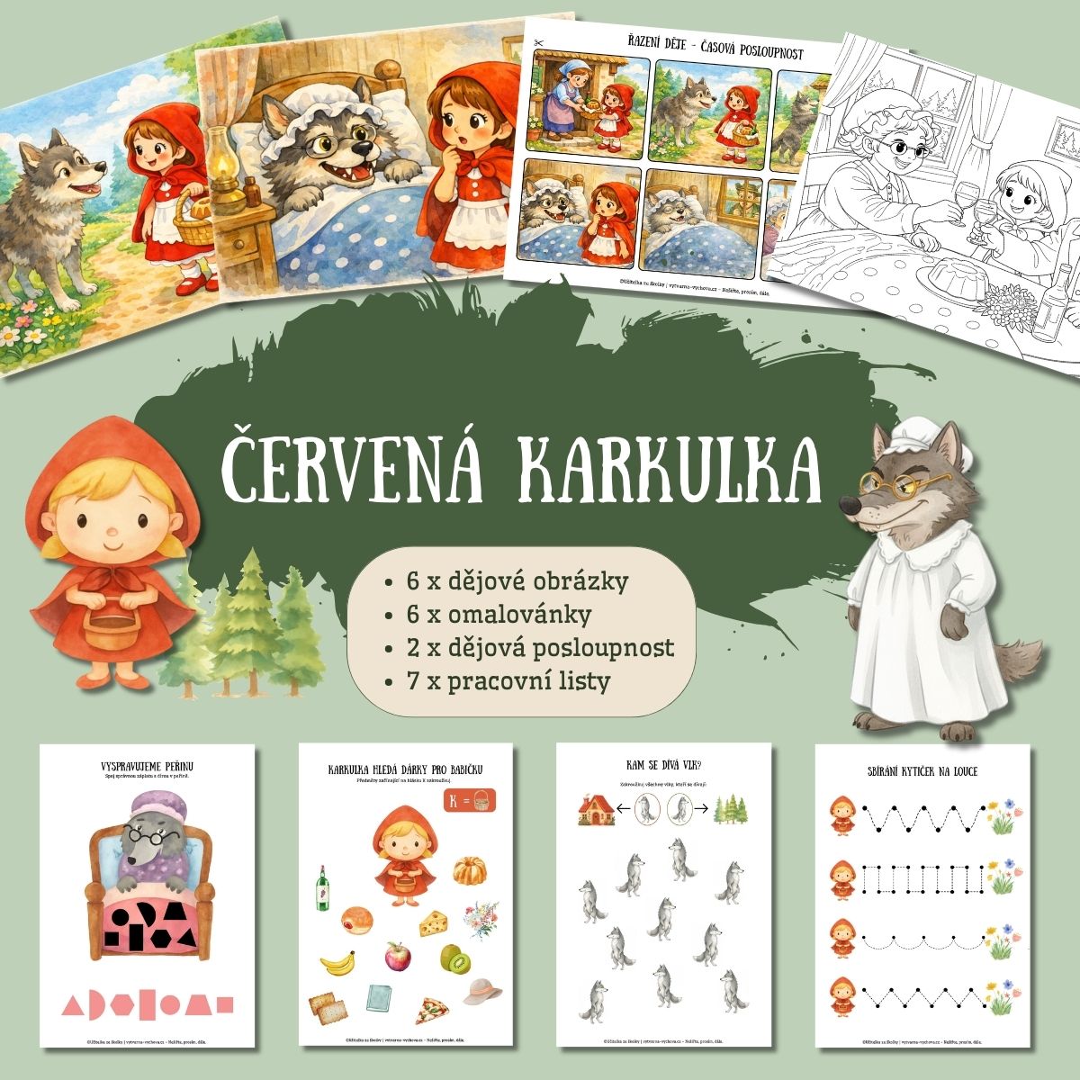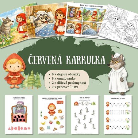 Barevné dějové ilustrace s identickými omalovánkami a tematickými úkoly o Červené Karkulce pro všestranný rozvoj dětí, které přirozeně doplňují aktivity s dětmi.
