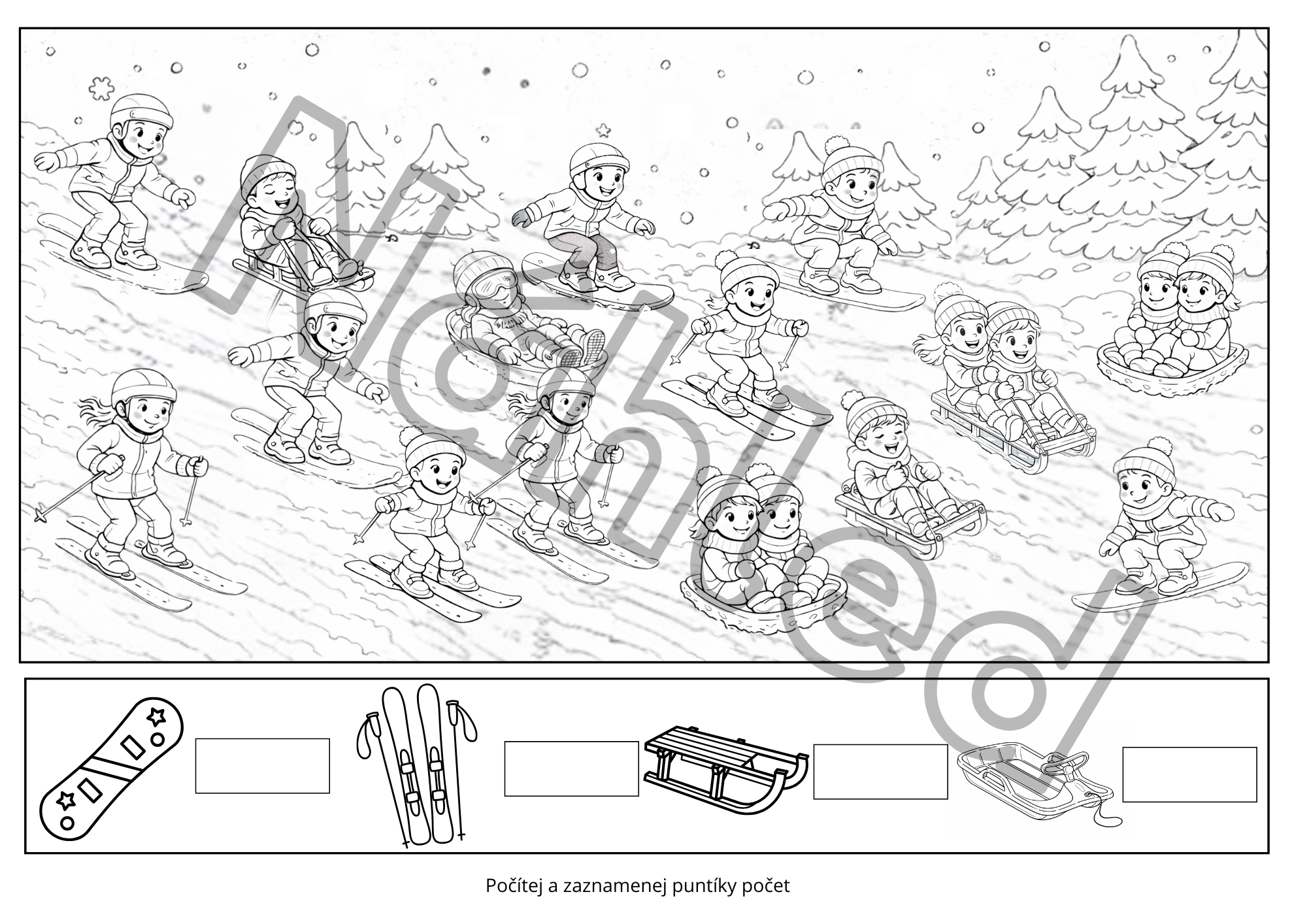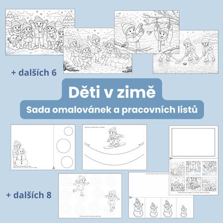 Pracovní listy a omalovánky plné zimního dovádění k rozvoji grafomotoriky, jemné motoriky, zrakového vnímání a základních matematických představ.