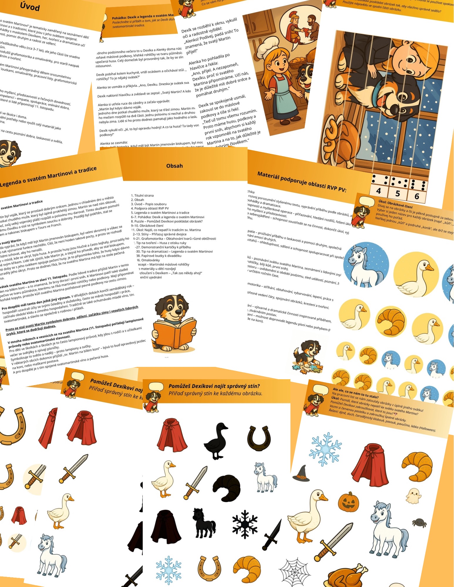 Soubor spojuje příběh, tvoření, pracovní listy i dramatizaci tak, aby si děti hravou formou zapamatovaly, kdo byl svatý Martin a proč přijíždí na bílém koni.