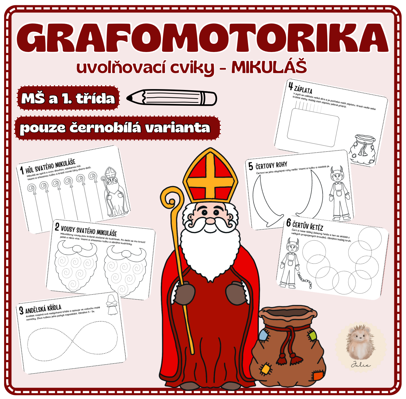 Grafomotorika – Mikuláš je tematická sada pracovních listů zaměřená na uvolnění ruky a přípravu na psaní. Materiál motivuje děti zábavnými prvky Mikuláše, anděla a čerta a vede je k opakování základních pohybů ruky pomocí vizuálně jasných grafomotorických stop.