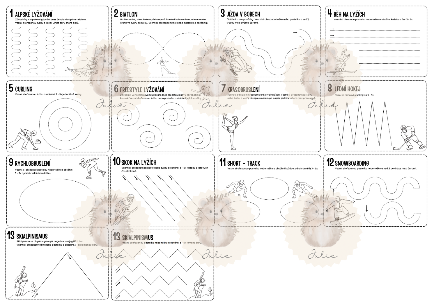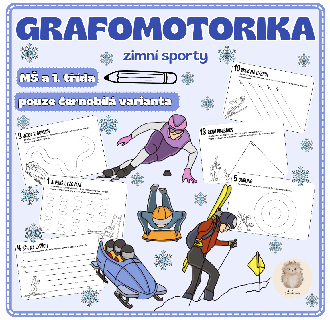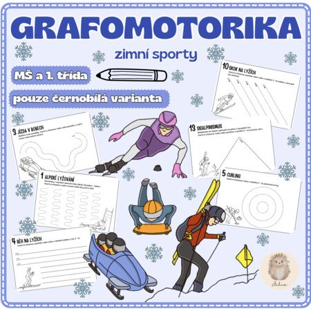 Uvolňovací cviky inspirované zimními sporty. Materiál obsahuje 13 různých grafomotorických cviků, které rozvíjí jemnou motoriku, správné držení psacího náčiní a koordinaci ruky a oka.