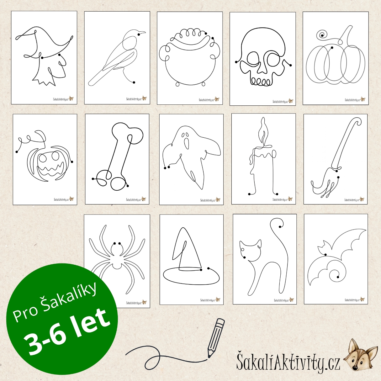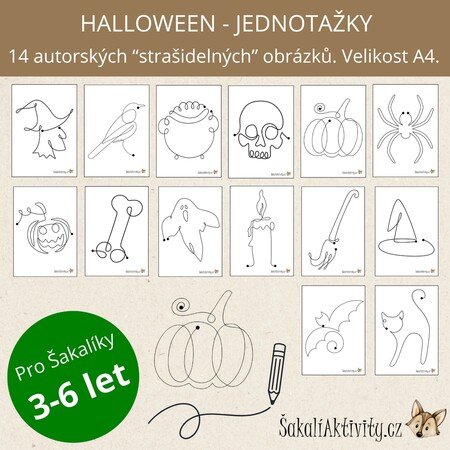 Jednotažky jsou vhodné pro děti od 3 let a lze je využít při grafomotorických cvičeních, tematických dnech, relaxačních činnostech nebo podzimních projektech o Halloweenu. Každý motiv propojuje vzdělávání a tvoření s fantazií – dýně, duch, pavouk, netopýr, čarodějnice nebo havran se stanou skvělými průvodci dětským učením.