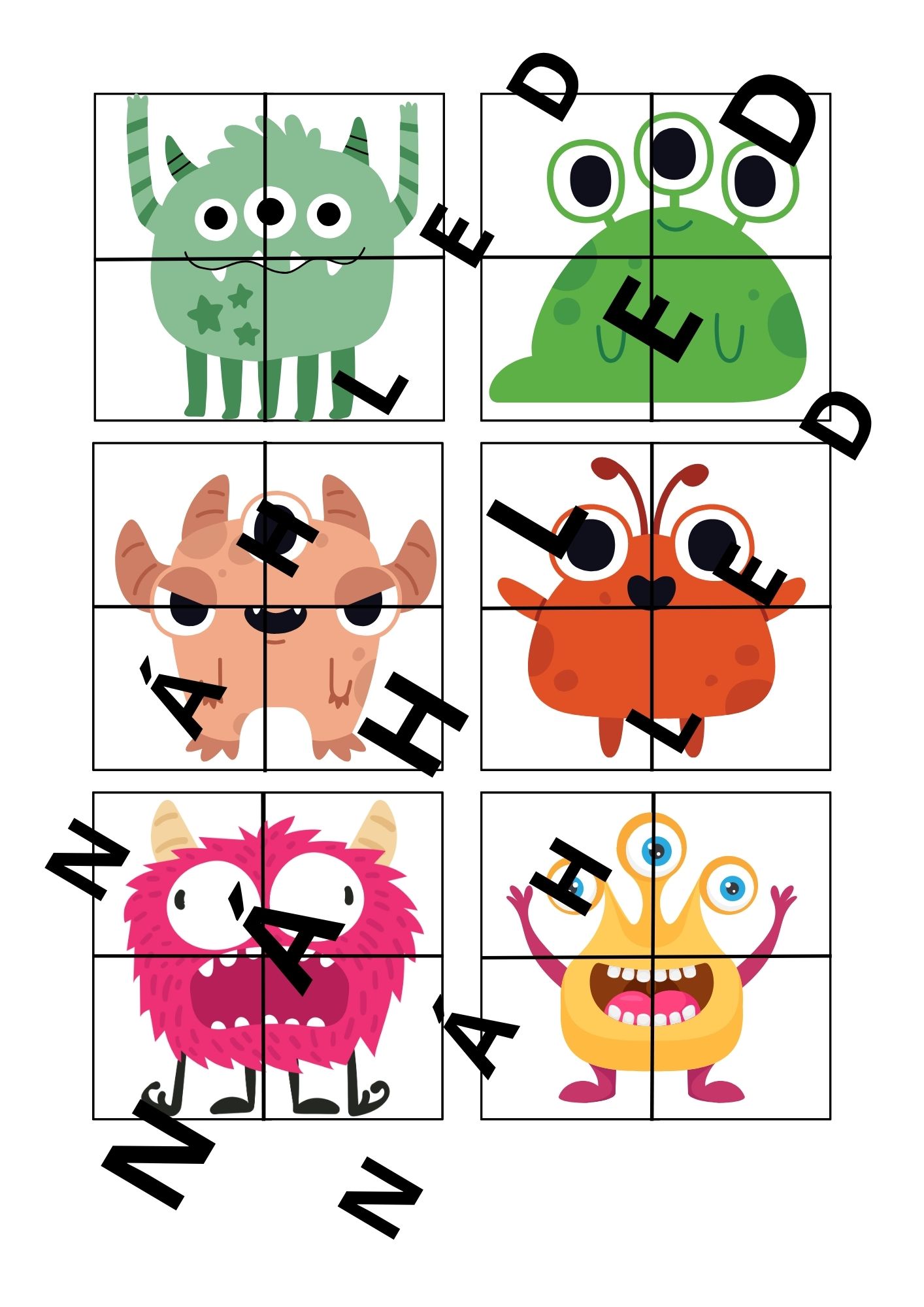 - Příšerácké puzzle - 6 obrázků příšerek (každý rozstříhaný na dvě části), 6 obrázků příšerek (každý rozstříhaný na čtyři části)