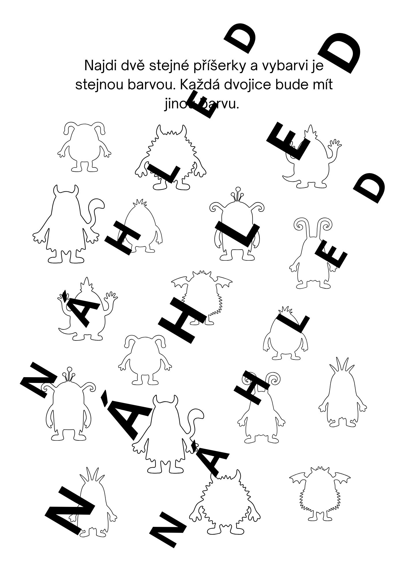 - Pracovní listy - celkem 5 pracovních listů (hledání a vykreslování stejných dvojic příšerek, dokreslování nohou pavoukům (grafomotorika), obrázkové bludiště, najdi 10 rozdílů, labyrint)