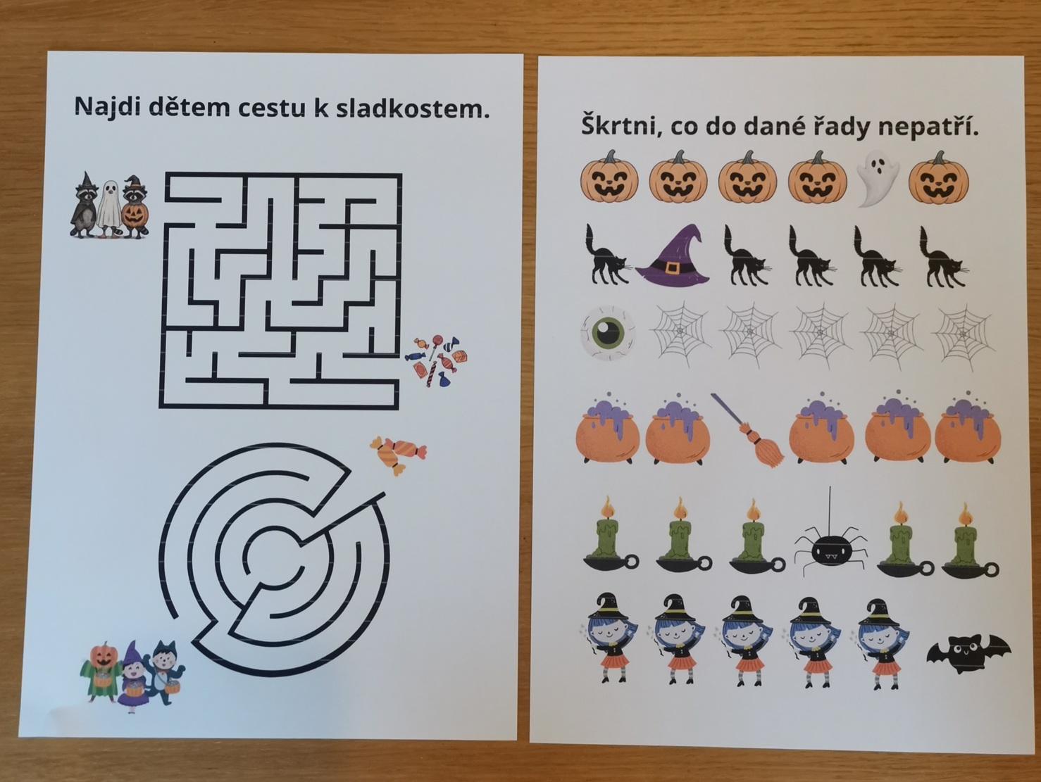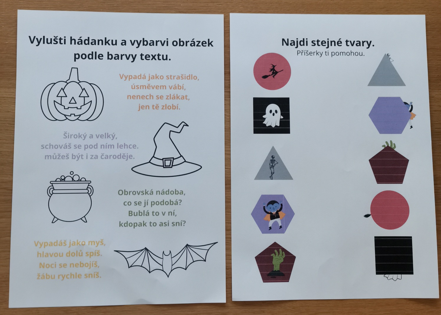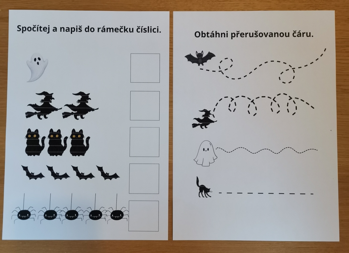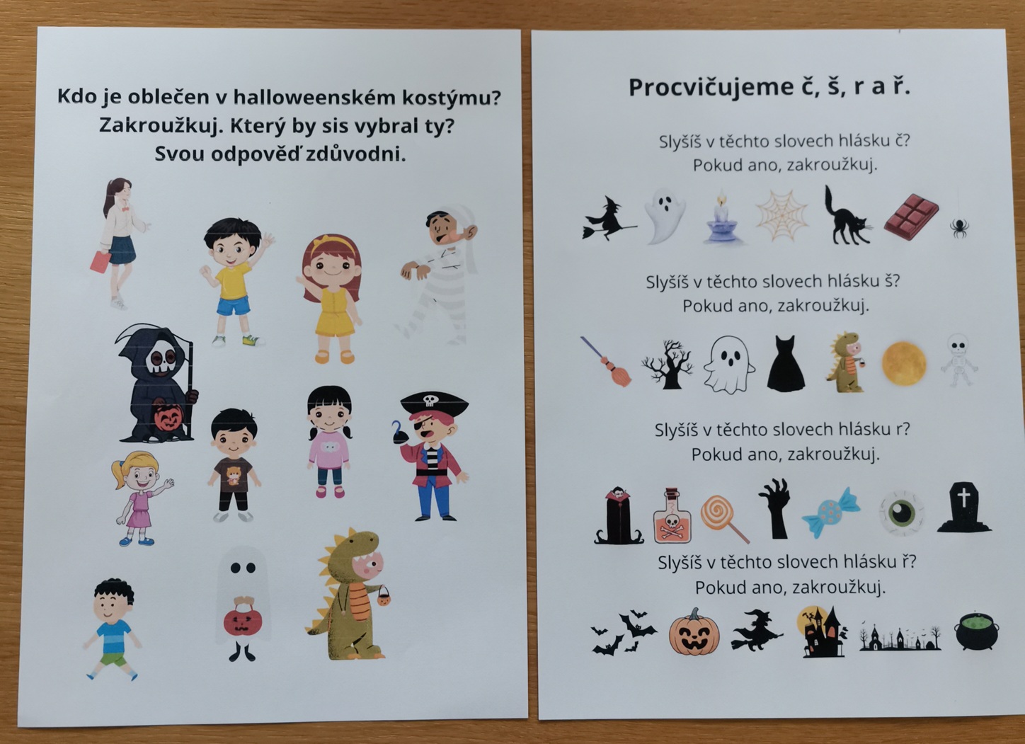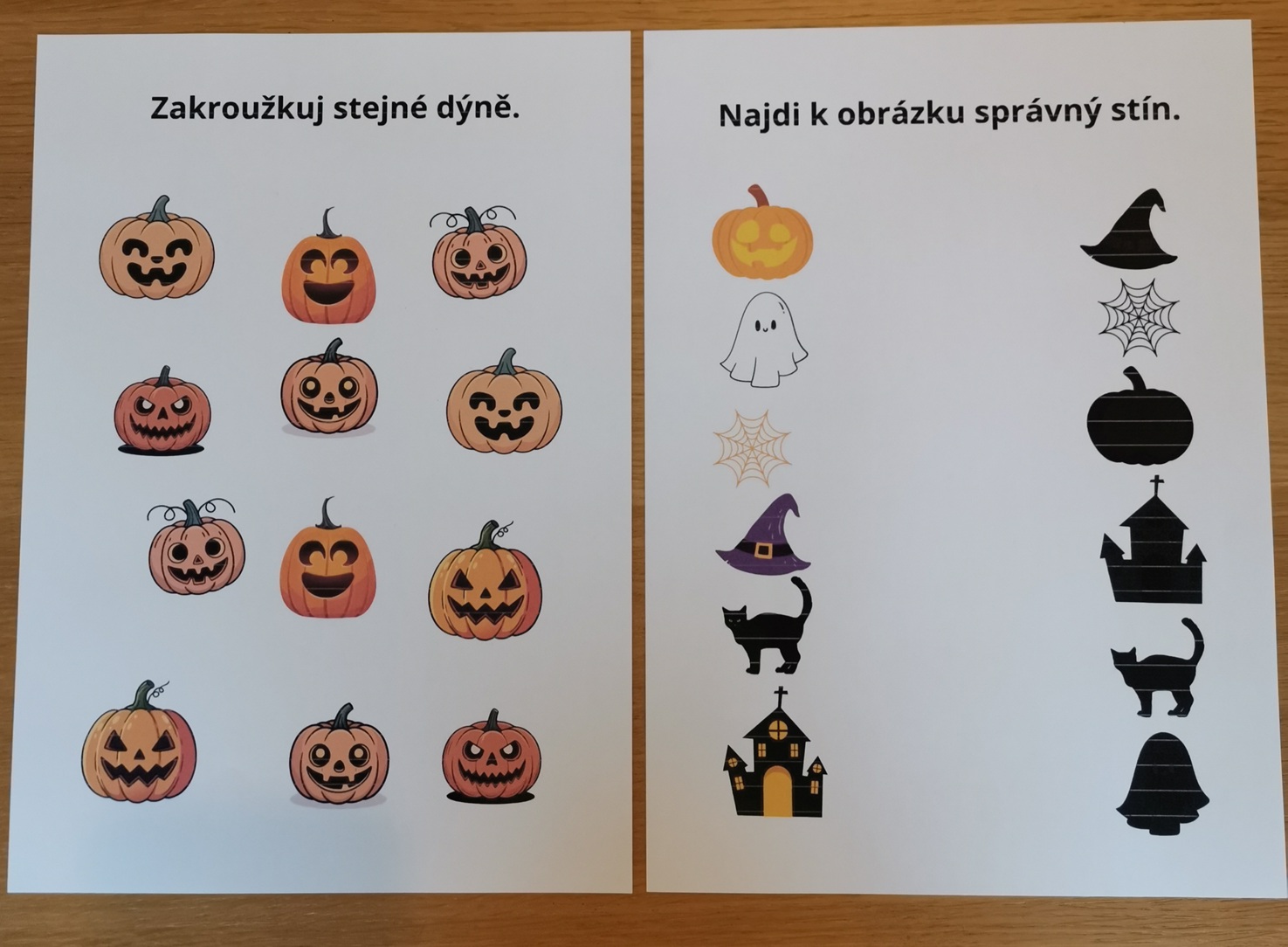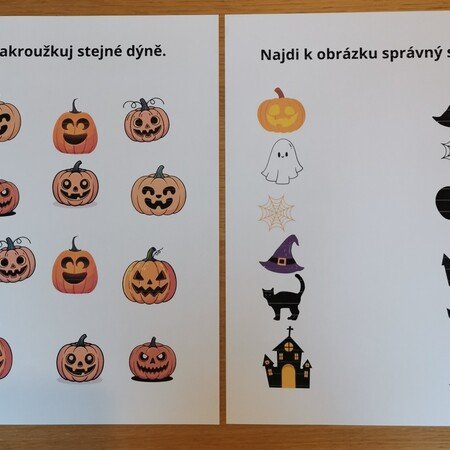 Jedná se o soubor 10 pracovních listů s tématem Halloween. Najdete tu pracovní listy s hledáním stejných dvojic, určováním správného stínu k obrázku, hledáním správné cesty bludištěm, počítáním od 1-5, luštěním logické řady, grafomotorickým cvičením, s hledáním dětí v halloweenském kostýmu, vybarvováním na základě krátkého čtení, logopedickým cvičením na vyvozování hlásky č, š, r a ř a s určováním stejných tvarů za pomoci halloweenských příšerek.
