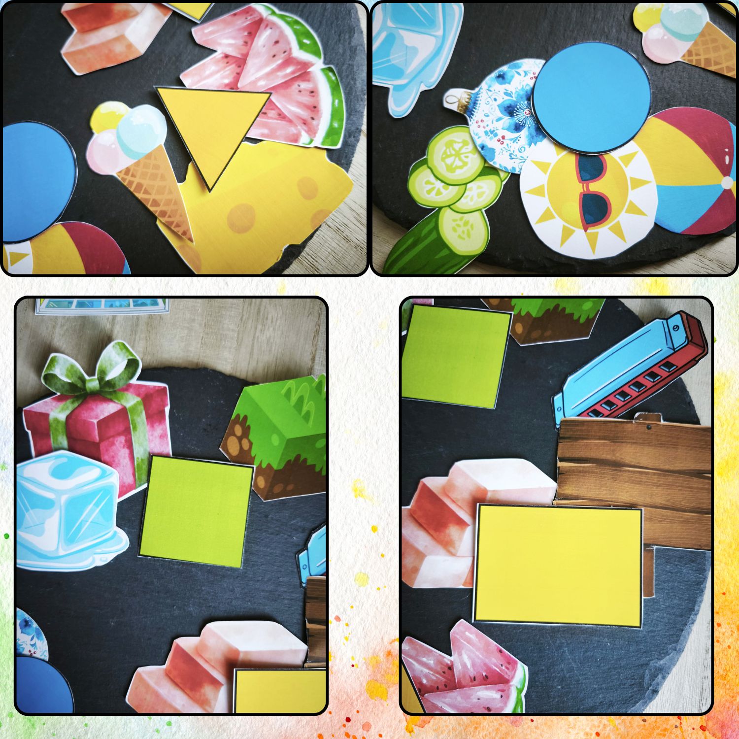 - Dítě přiřazuje předměty na obrázku ke správným tvarům (kruh, čtverec, trojúhelník, obdélník).