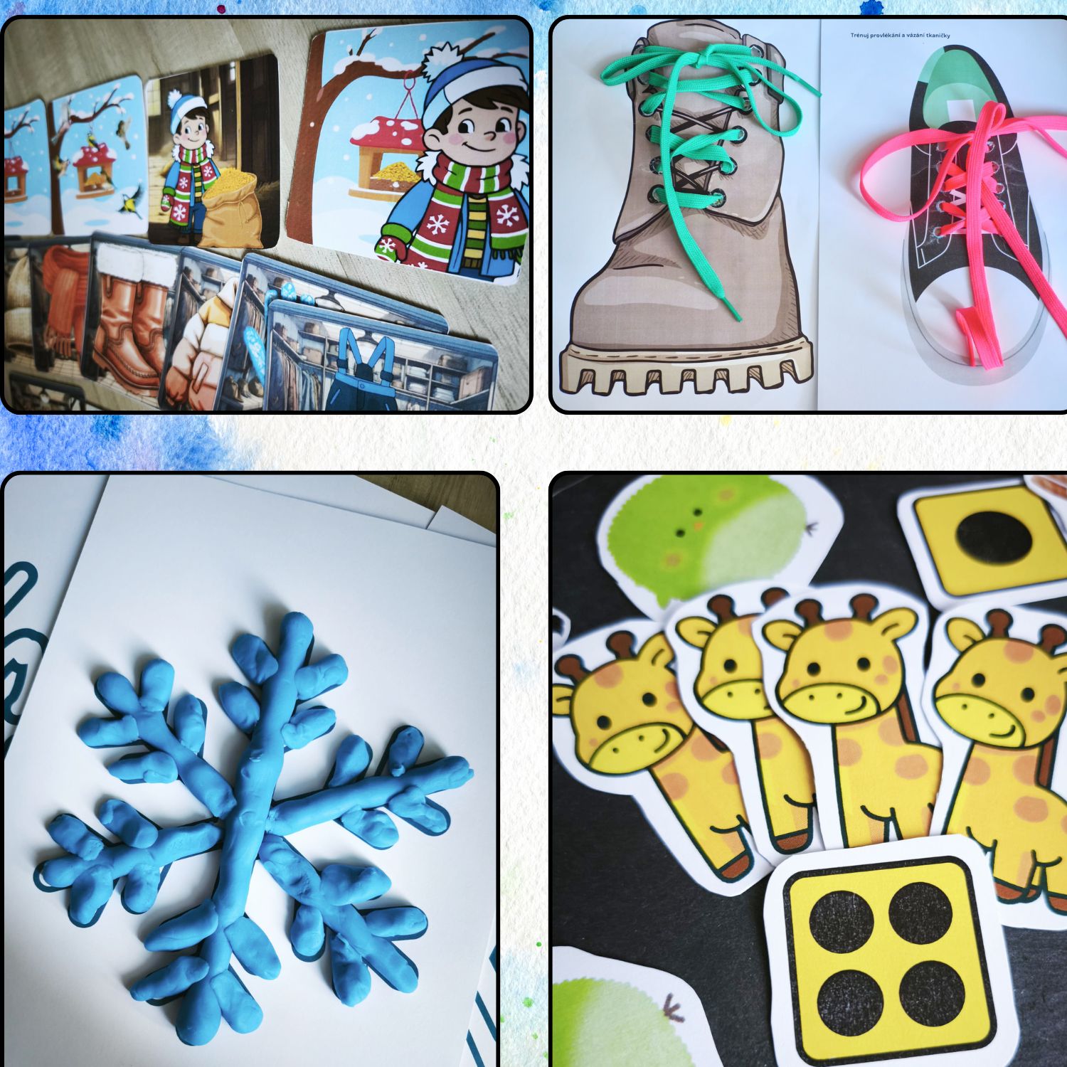 - Dítě vytváří vločku z modelíny podle obrázků (může přikládat na obrázek modelínu)