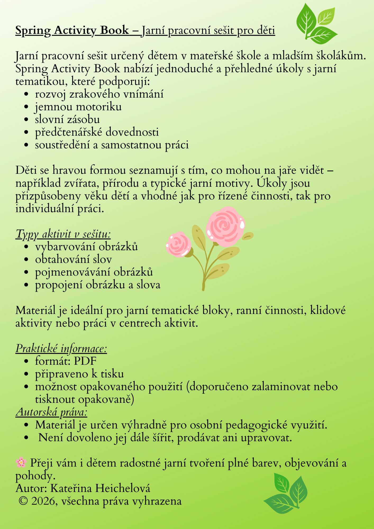 Materiál je ideální pro jarní tematické bloky, ranní činnosti, klidové aktivity nebo práci v centrech aktivit.