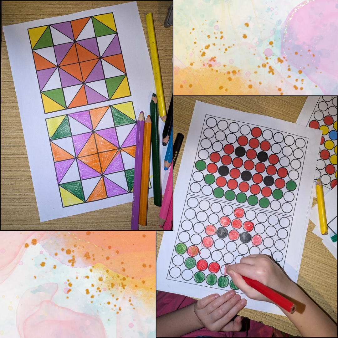 Sada obsahuje 10 obrázků "kaleidoskop" a 10 obrázků tvořených kolečky. Celkem tedy 20 předloh.