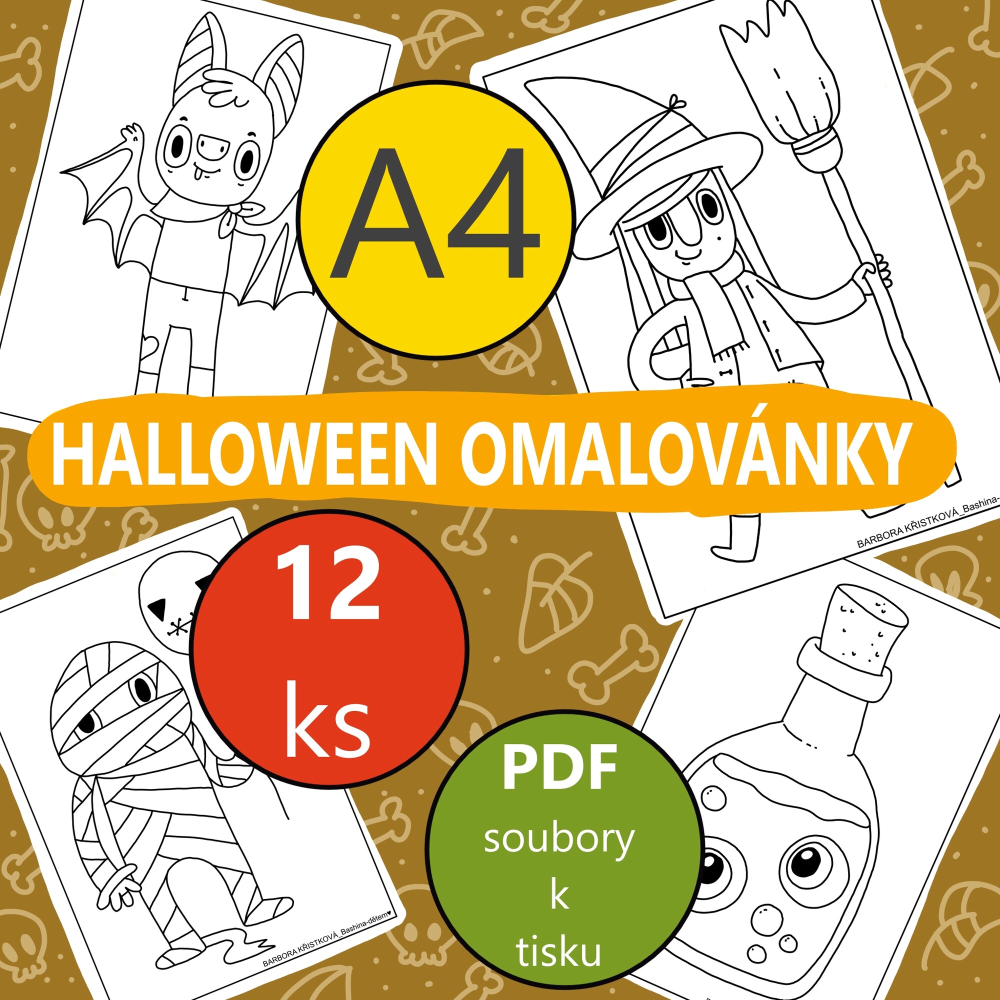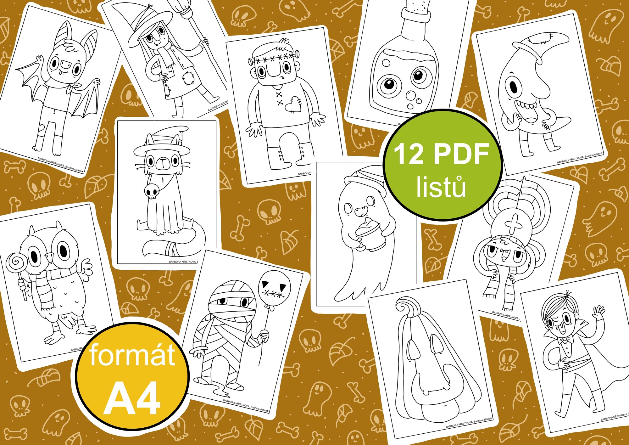 Halloween omalovánky – sada 12 autorských ilustrací k vytištění (PDF, A4).