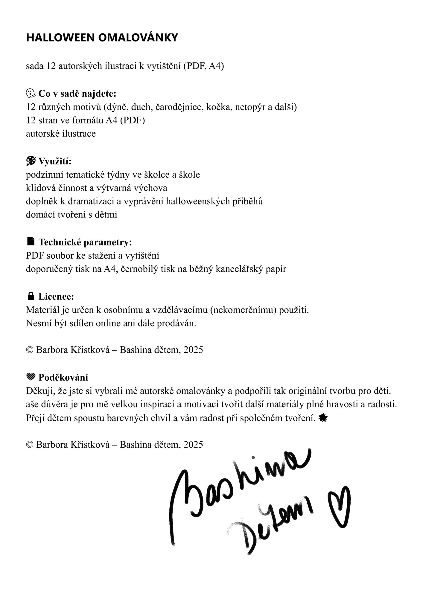 Tato sada obsahuje 12 originálních autorských omalovánek s halloweenskou tematikou.