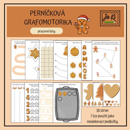 Soubor 35 pracovních listů na procvičování grafomotorických dovedností dětí školkového, zejména pak předškolního věku - vše s perníčkovou tematikou. Procvičují se jednotlivé grafomotorické prvky jako kruh, čáry, oblouky, tečky, vybarvování, procházení "cestičky", obtahování geometrických tvarů, spojování stejných prvků atd. 7 listů ze souboru je k samostatnému domalování/dotvoření dle vlastní fantazie nebo předlohy a po zalaminování je lze použít i jako modelovací podložku.