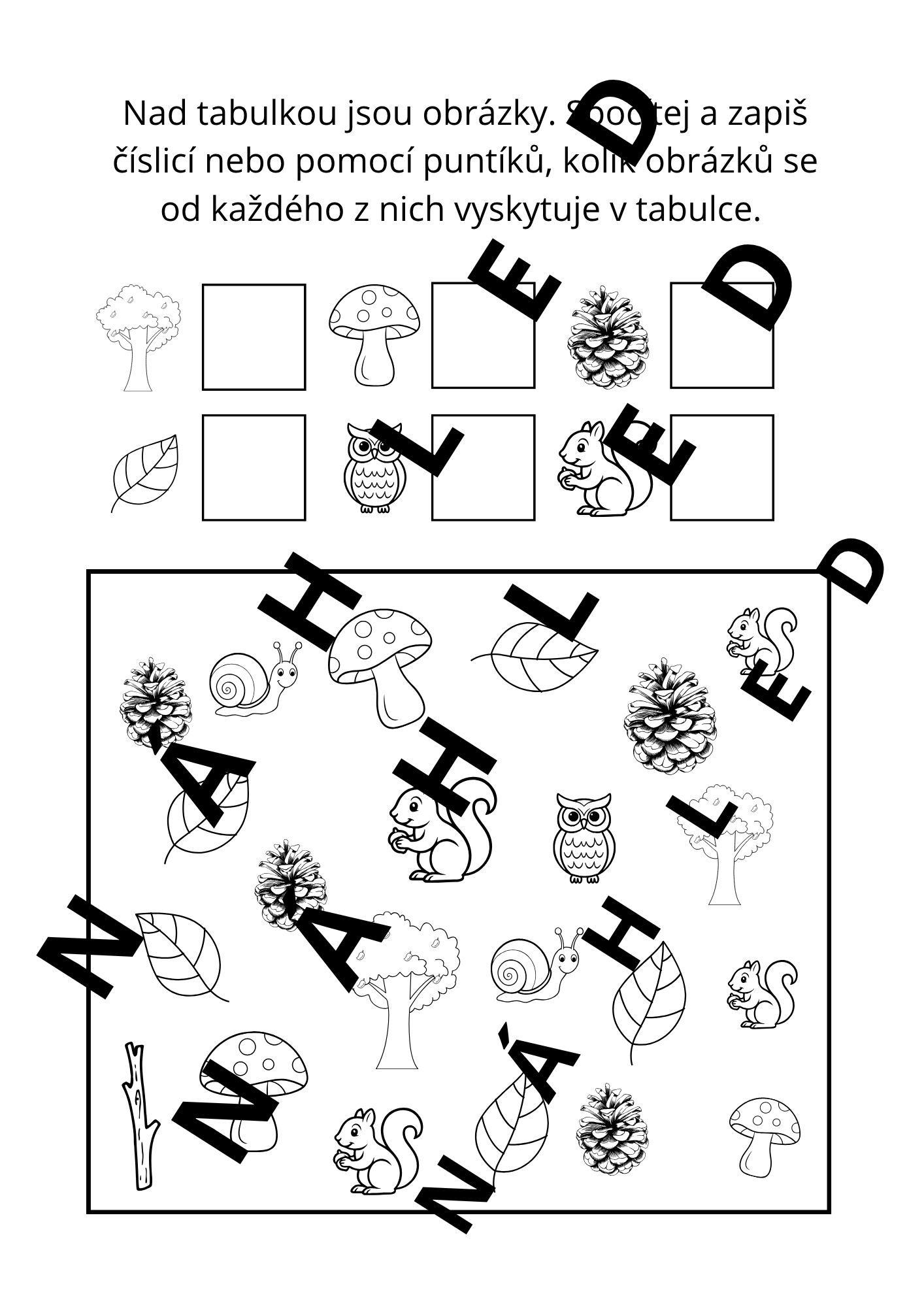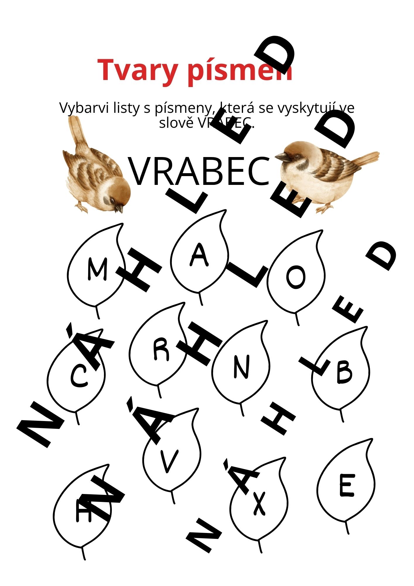 - str. 35 - 37 - tvary písmen (vykresli lístky s písmeny, které tvoří slovo SOVA, ZAJÍC, VRABEC)