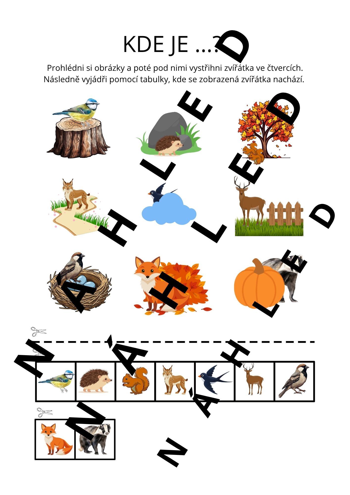 - str. 15 - 16 - Kde je...? - procvičení jemné motoriky (stříhání), prostorové orientace a předložek před, za, vedle, na, pod, v
