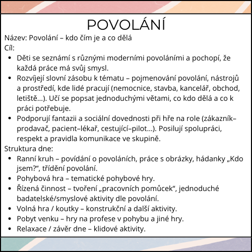 ✅ Ideální jako tematický týden, kdy děti povolání opravdu prožijí hrou, pohybem i tvořením.