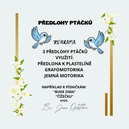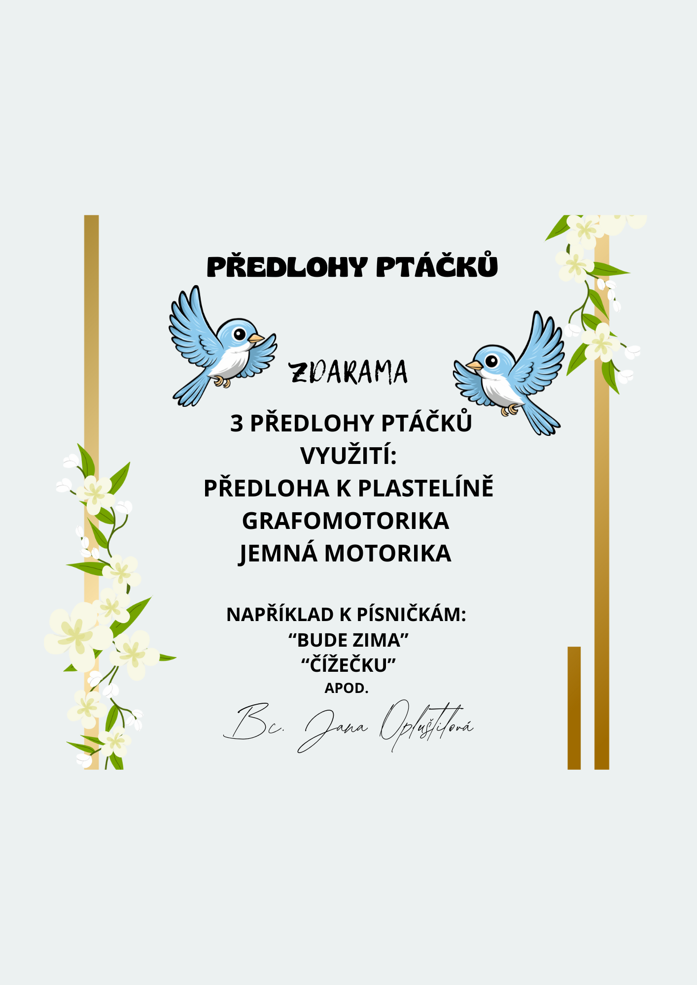 Tento materiál obsahuje 3 jednoduché předlohy ptáčků, které slouží jako podklad pro rozvoj jemné motoriky, koordinace ruky a oka a soustředění u dětí předškolního a mladšího školního věku. Předlohy jsou záměrně jednoduché, přehledné a bez zbytečných detailů, aby se dítě mohlo soustředit na samotnou činnost a ne na „správnost výsledku“.