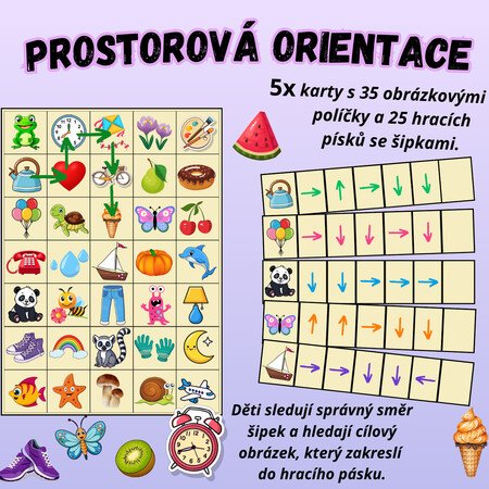 🌞Děti sledují šipky, jejich správný směr a hledají cílový obrázek. Tento cílový obrázek zakreslí do posledního políčka hracího pásku. Hrací pásky a karta s obrázky je zobrazena v náhledu.