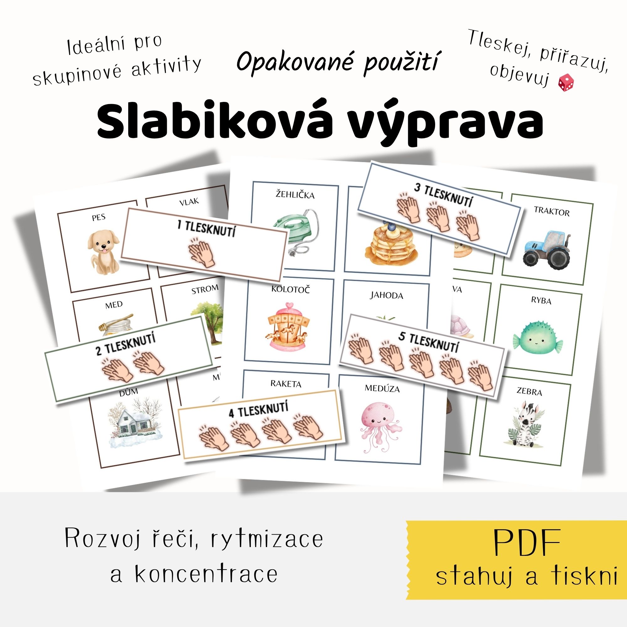 Slabiková výprava 👏 — kartičky pro tleskání a přiřazování slabik (1–5 slabik)