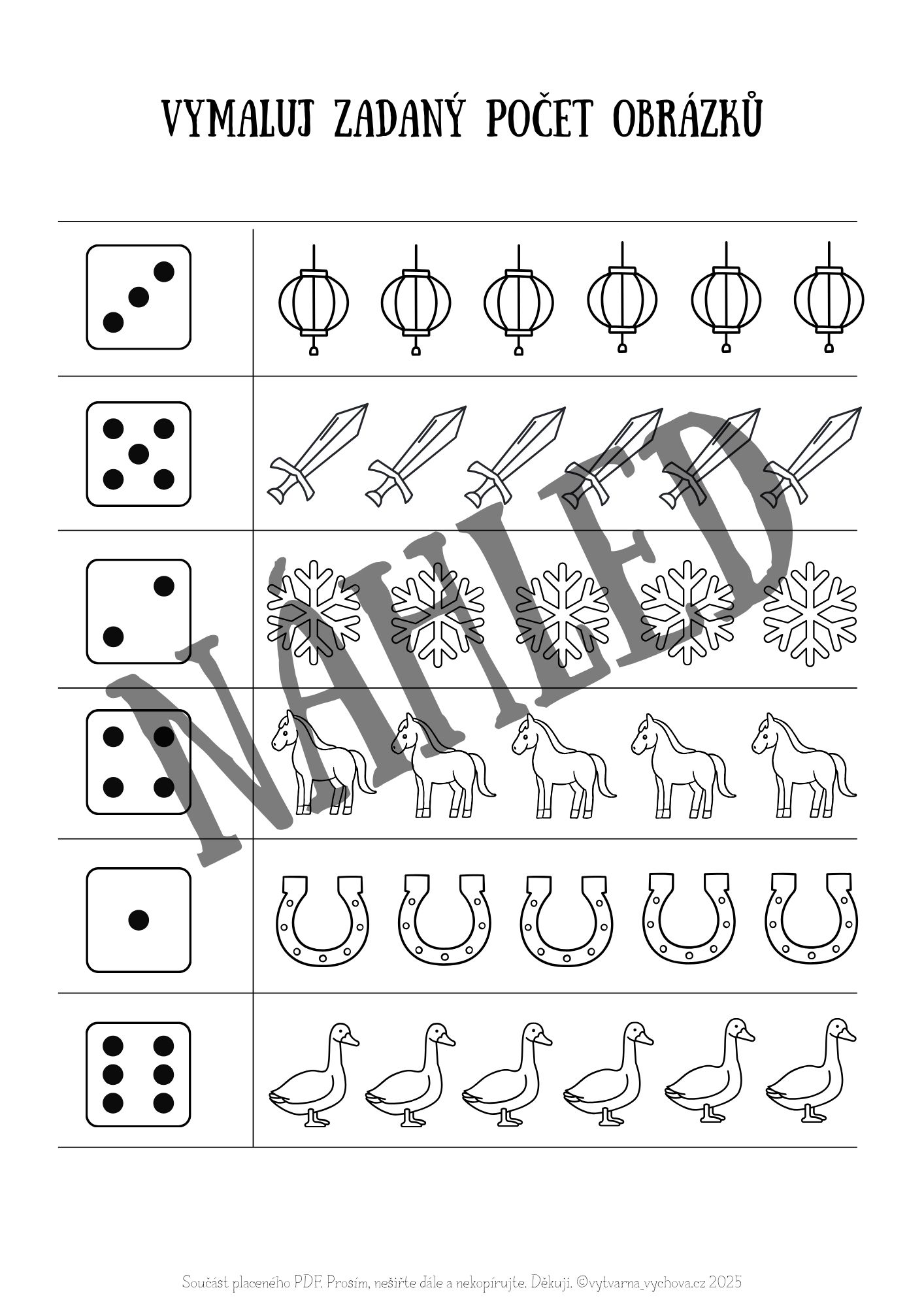 - PRACOVNÍ LISTY jsou zaměřené na zrakové vnímání, sluchové vnímání, předmatematické schopnosti (počty, velikosti), prostorovou orientaci, logické souvislosti, na rozvoj jemné motoriky (grafomotorika, tečkování, dokreslování, skládání).