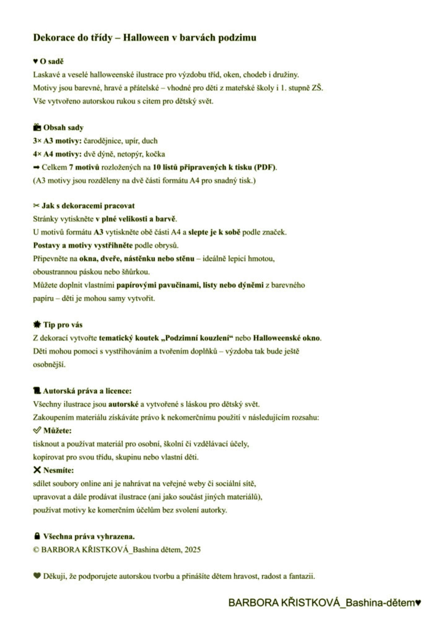 Součástí jsou pokyny k tisku, vystřihování a lepení, vše připravené tak, aby dekorace krásně vynikly na oknech, dveřích, nástěnkách nebo zdech.