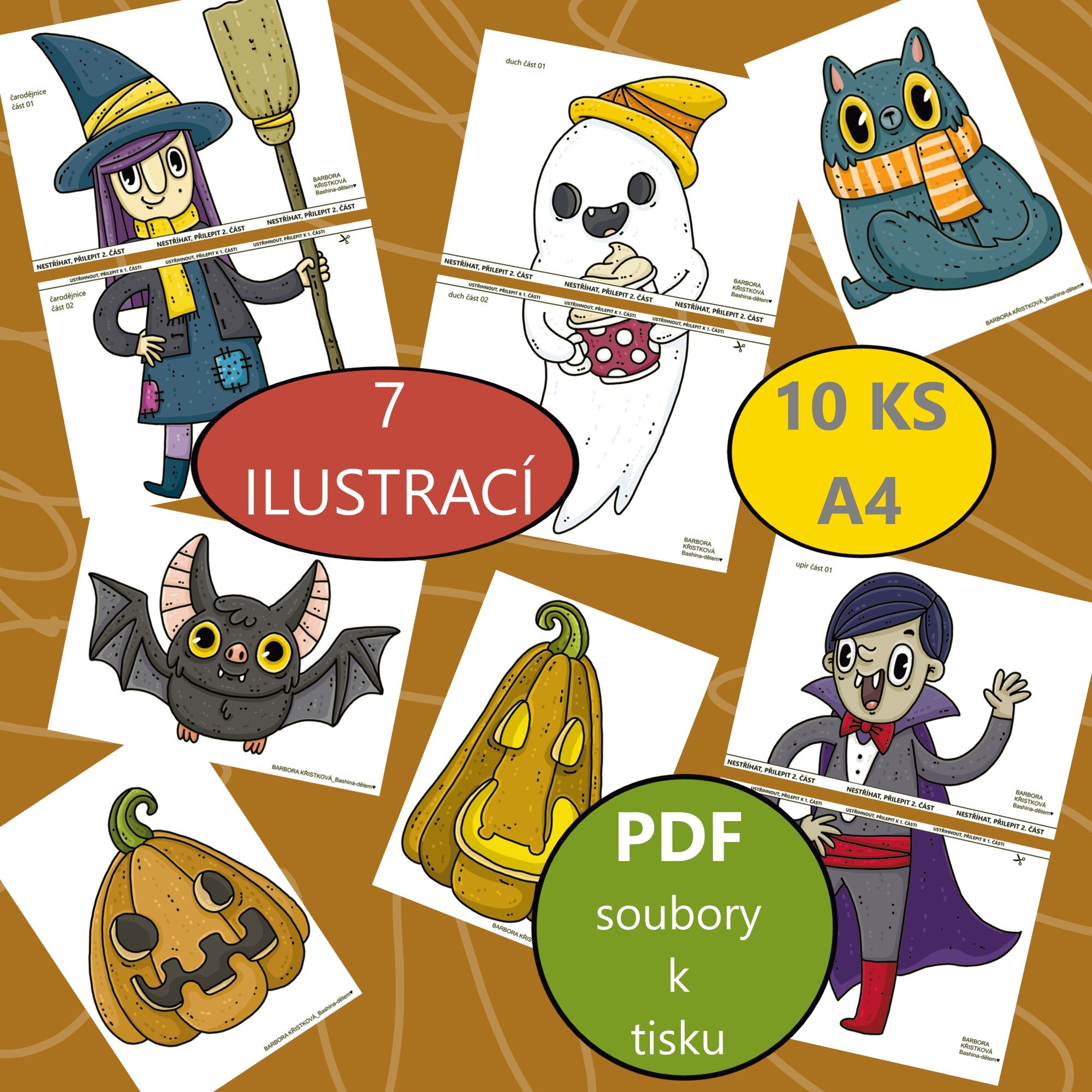 - 3× A3 – čarodějnice, upír, duch (každý motiv rozdělen na dvě části A4 pro snadný tisk a slepení)