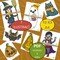 Postavičky čarodějnice, upíra a ducha jsou přátelské, veselé a doplňují je dýně, netopýr a kočka v teplých barvách podzimu.