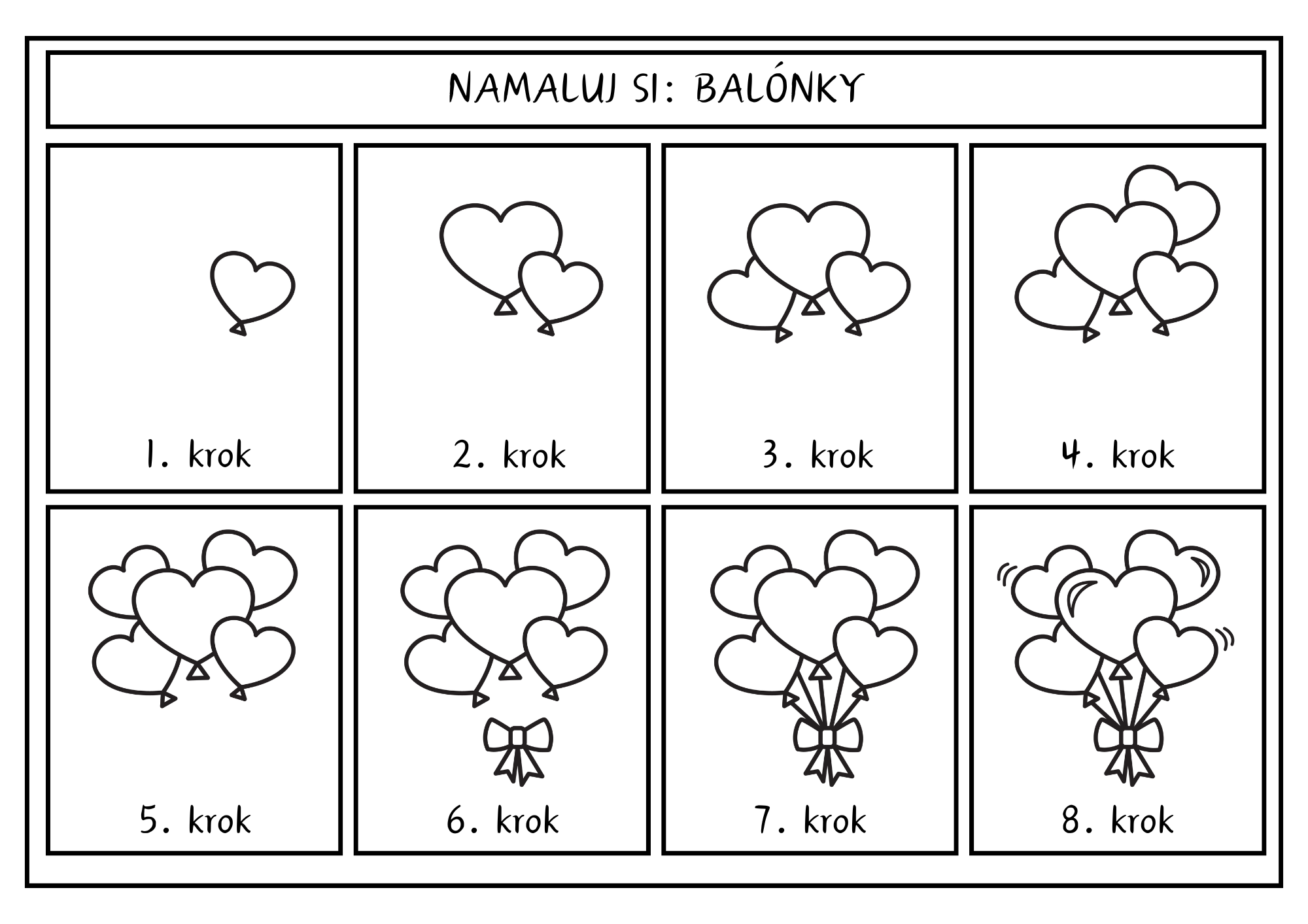 Materiál obsahuje 10 valentýnských motivů, u kterých je každý zpracován do dvou částí – názorného postupu kreslení a samostatného pracovního listu pro vlastní kresbu dítěte.