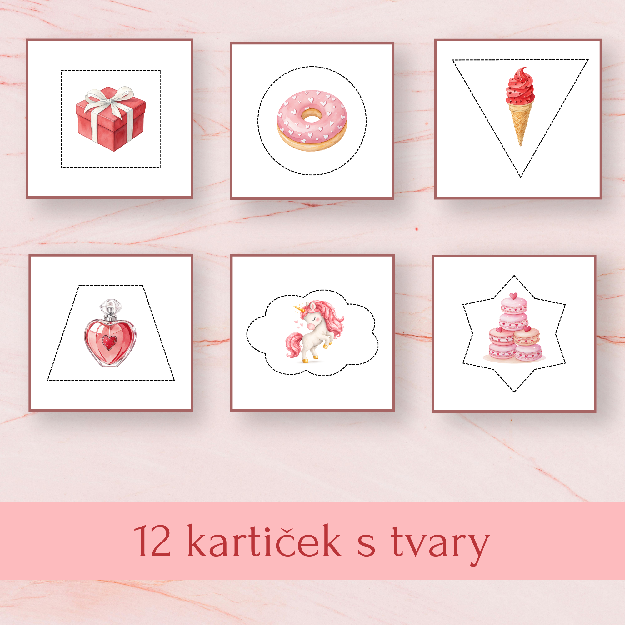 Soubor obsahuje 5 stran pásků pro postupné stříhání a 2 strany kartiček s tvary (celkem 12 kartiček). Materiál stačí vytisknout, rozstříhat podle vyznačených linií a dítěti nabízet postupně podle jeho připravenosti.