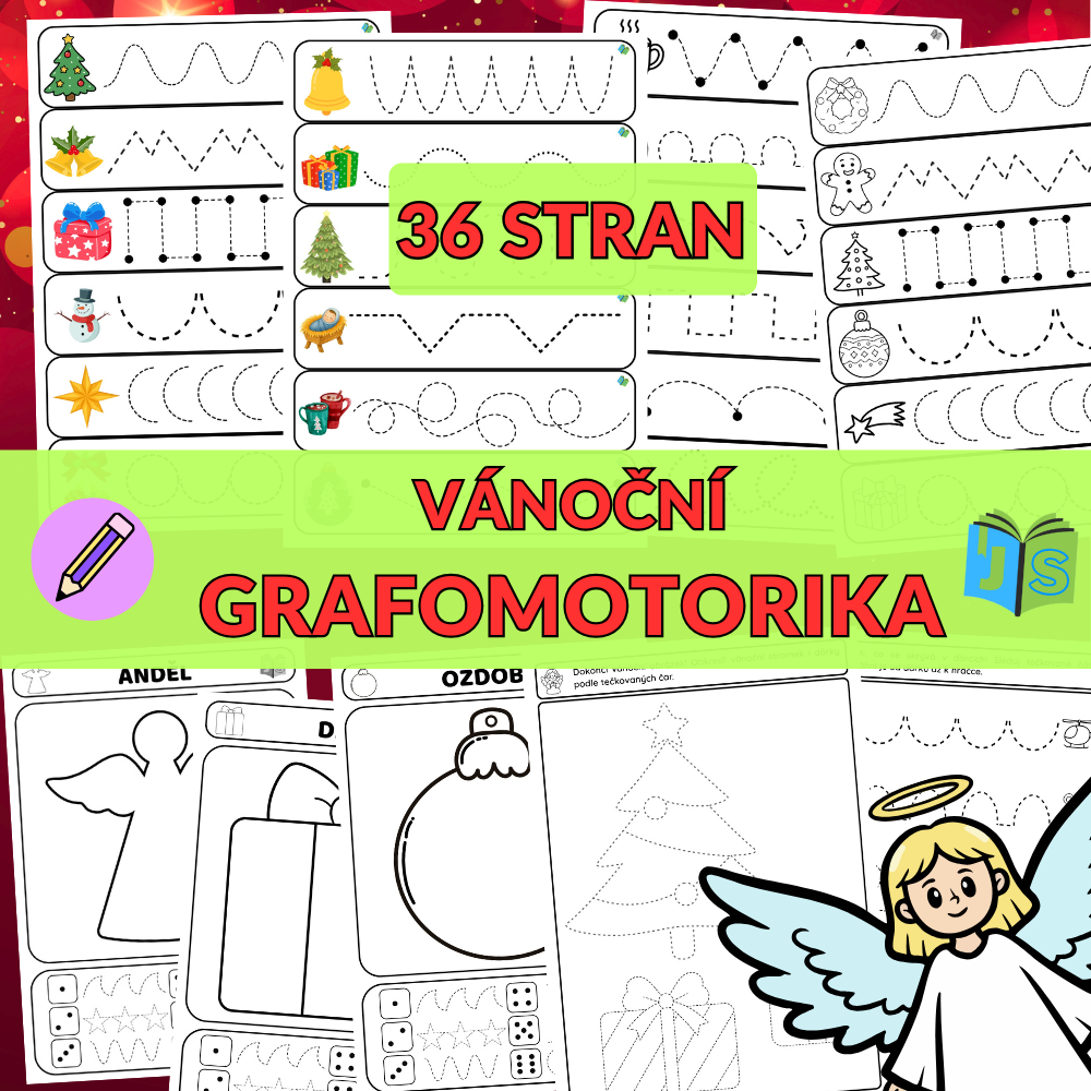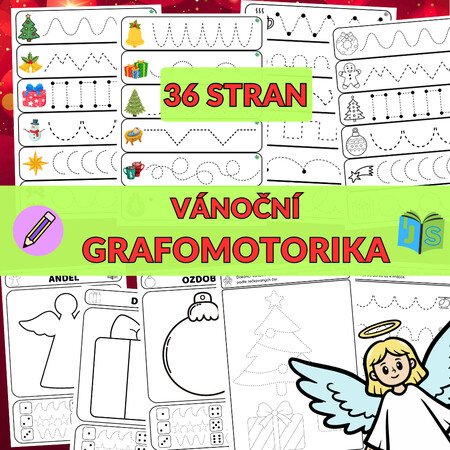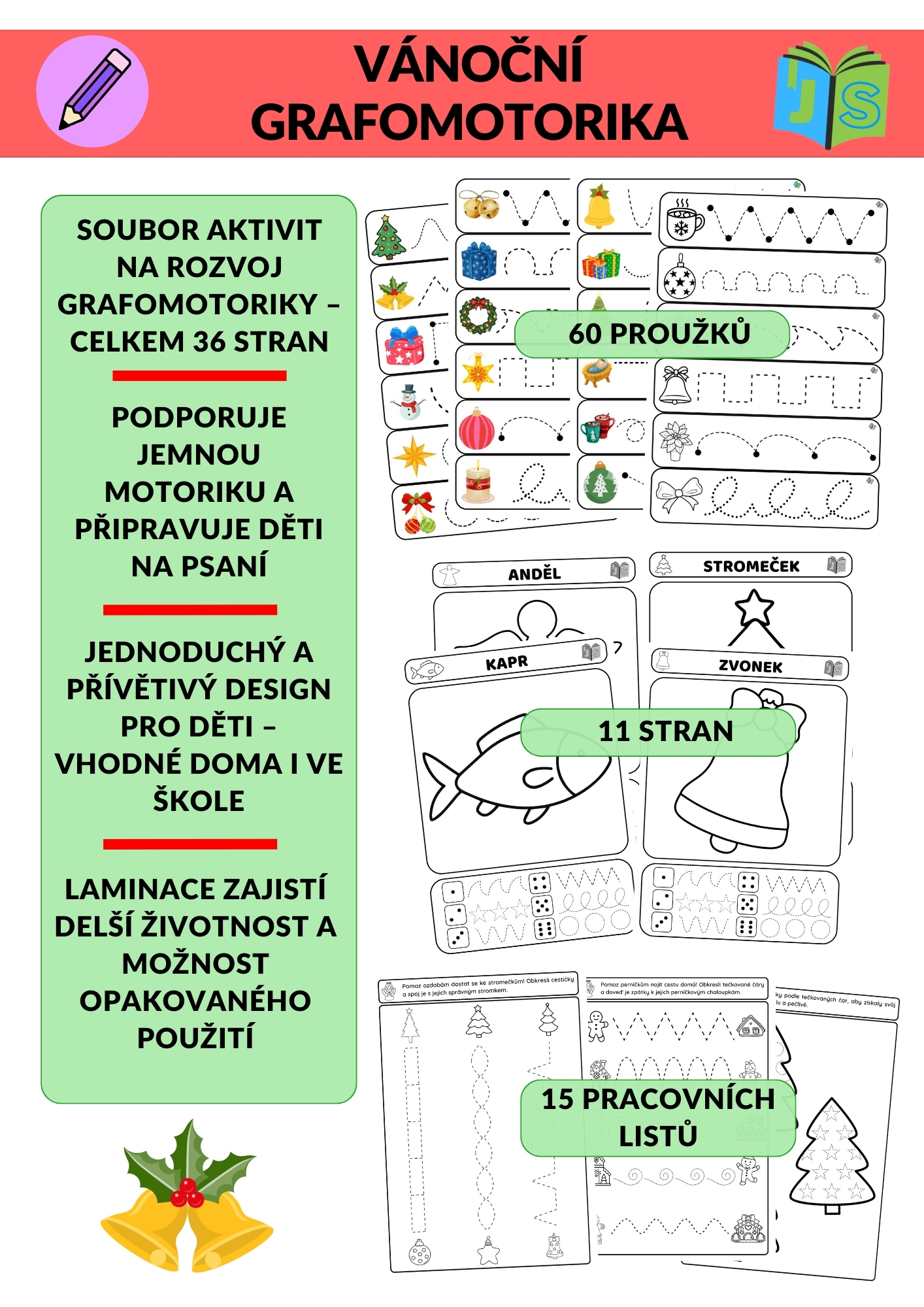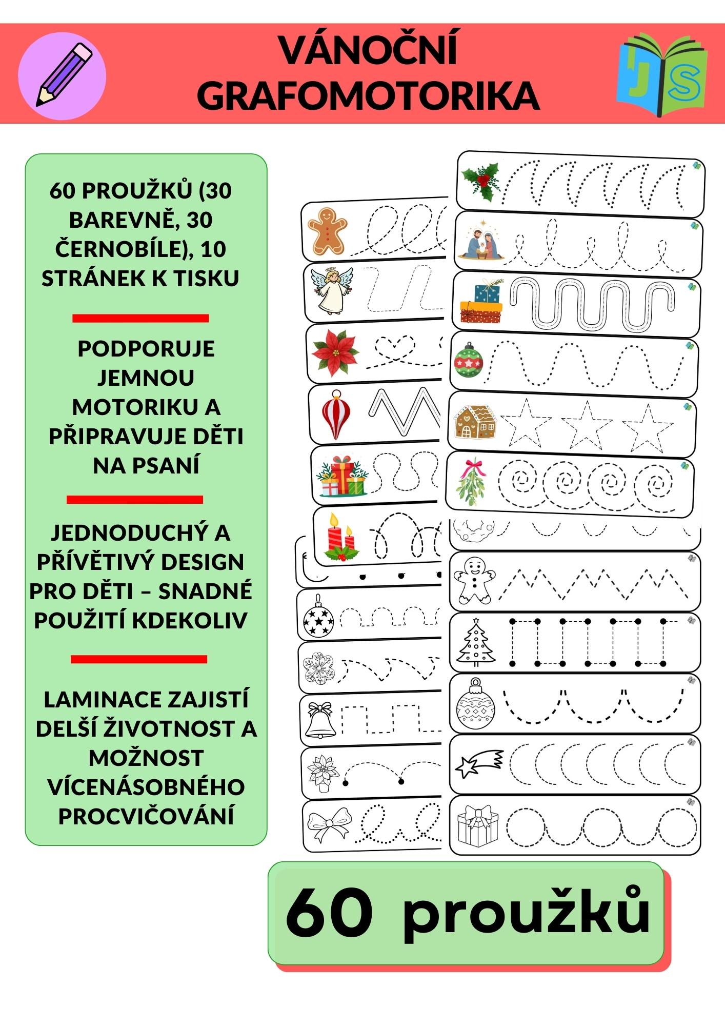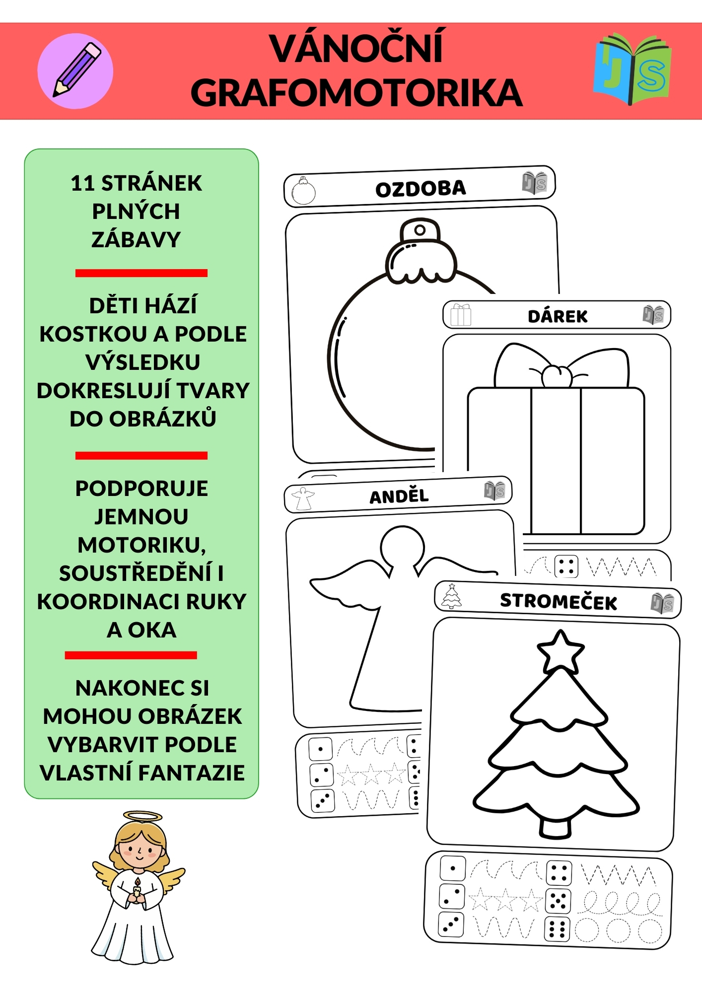 Vánoční grafomotorika je soubor 36 stran aktivit, které pomáhají dětem rozvíjet jemnou motoriku, koordinaci ruky a oka, vizuální vnímání i předpsací dovednosti. Materiál obsahuje celkem 60 grafomotorických proužků (30 barevně, 30 černobíle), 11 hravých listů s kostkou a 15 pracovních listů zaměřených na obtahování, spojování a dokončování tvarů.