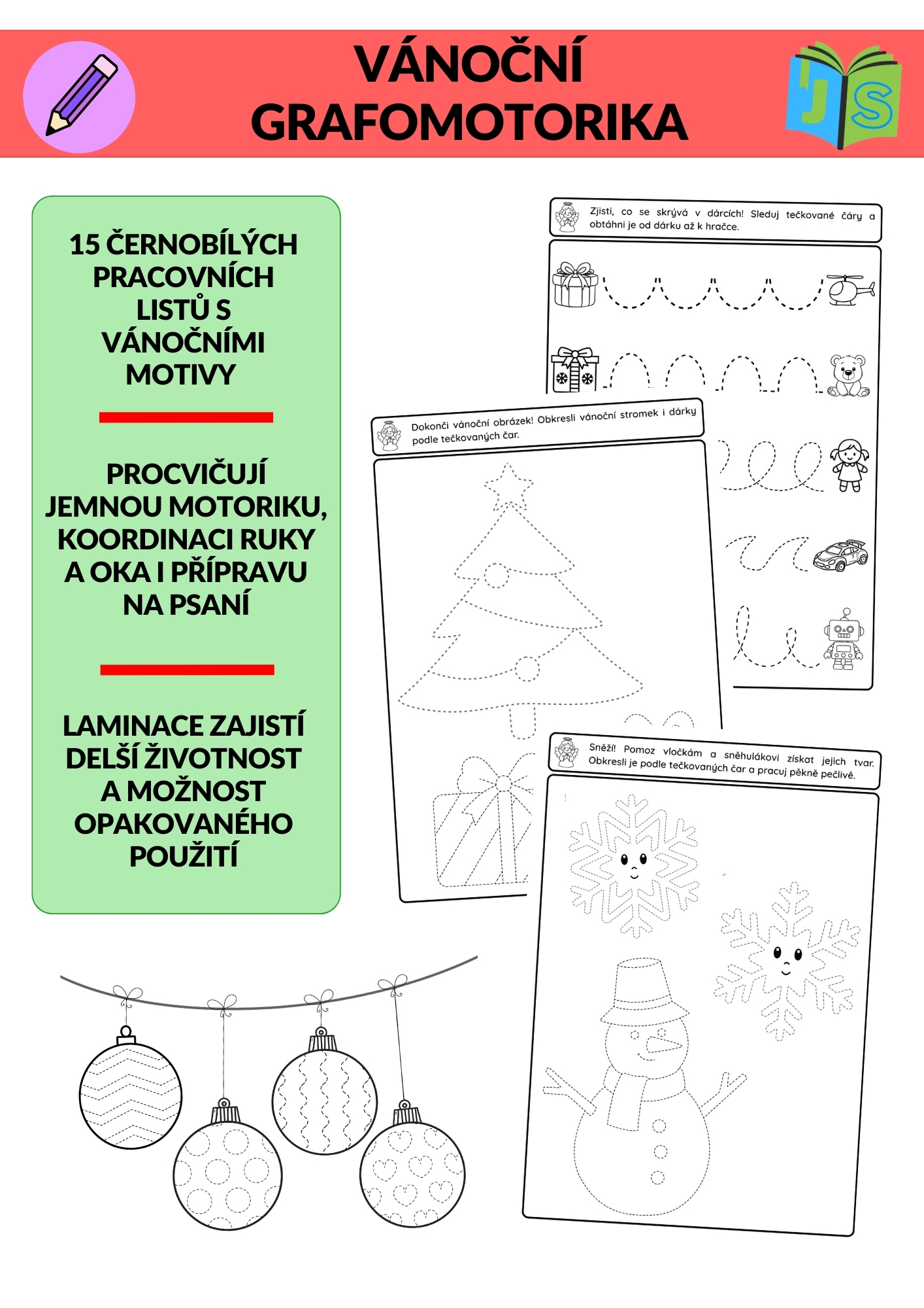 Aktivity jsou vhodné pro děti od 3 do 7 let, skvěle se hodí do mateřských škol, přípravných ročníků, 1. třídy i pro domácí procvičování. Laminace zajistí dlouhou životnost a možnost opakovaného použití. Perfektní materiál pro rozvoj grafomotoriky v zábavné vánoční atmosféře.