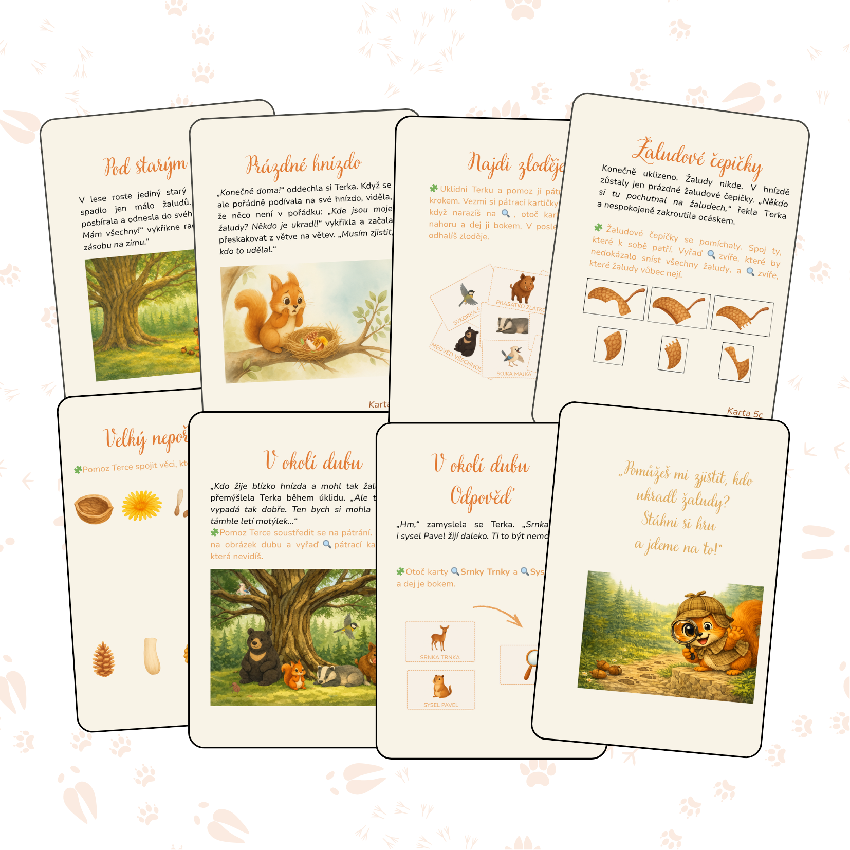 Když Veverce Terce zmizí zásoba žaludů, musí zapojit hlavu i srdce. Jenže Terka nevydrží stát na místě a v klidu hledat stopy. Právě proto potřebuje trpělivého parťáka. Znáš malého detektiva, který Terce pomůže? Pro předškolní děti.
