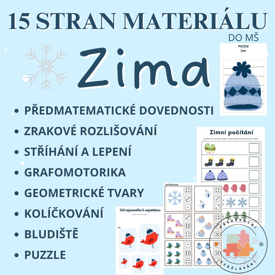 Tento zimní vzdělávací balíček je určen pro děti ve věku 3–6 let a nabízí pestrou sadu pracovních listů zaměřených na rozvoj předmatematických dovedností, grafomotoriky, jemné motoriky a zrakového vnímání. Materiál je ideální pro mateřské školy, přípravné třídy i domácí vzdělávání.