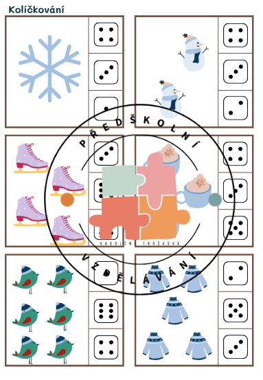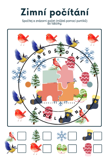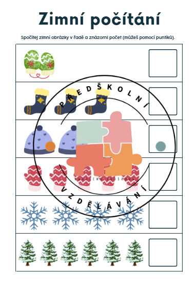 - Počítání zimních obrázků – určování počtu, zapisování čísel nebo počtu puntíků, jednoduché tabulky.