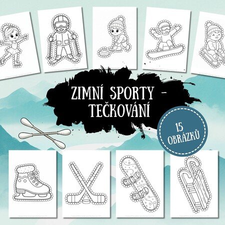 - 15 černobílých obrázků (brusle, bruslařka, hokejky s pukem, lyže s hůlkami, lyžařské boty, lyžař, snowboard, lyžařská helma, snowboardista, curlingový kámen, curler, skeletonista, sáňky, dítě na saních, kluzák na sníh)