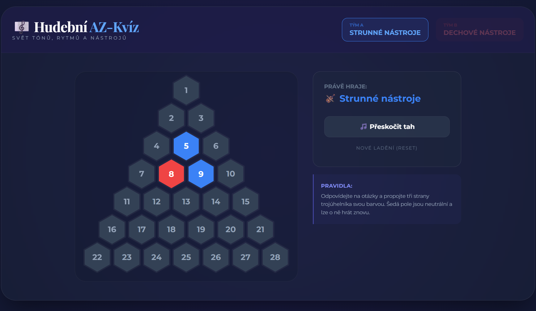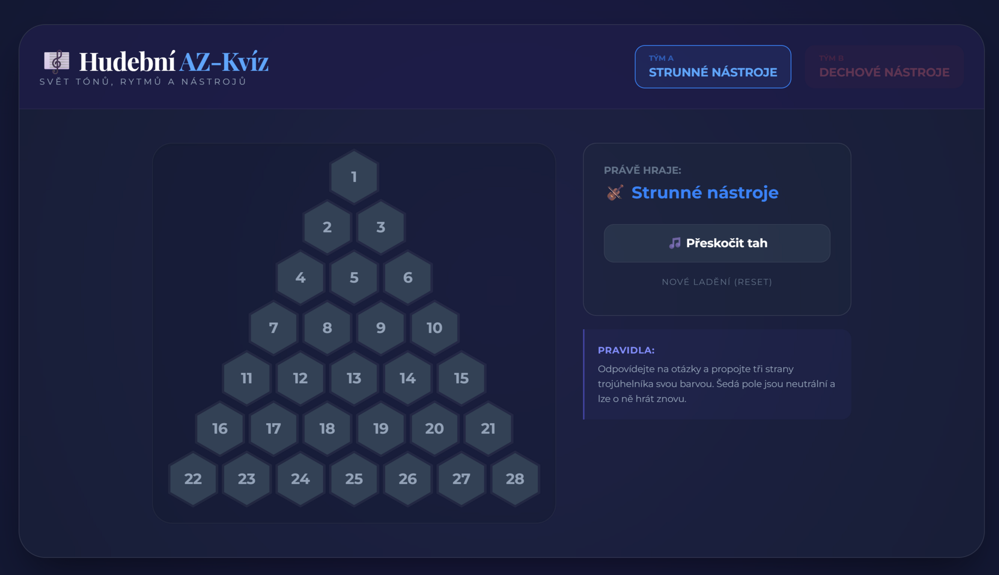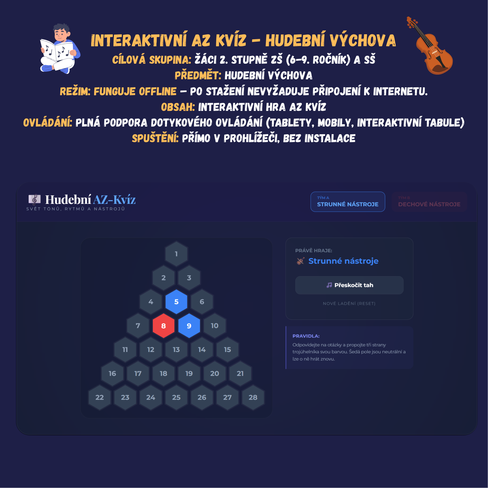 - Design: Kontrastní vizuální styl se dvěma týmy (Strunné vs. Dechové nástroje).
