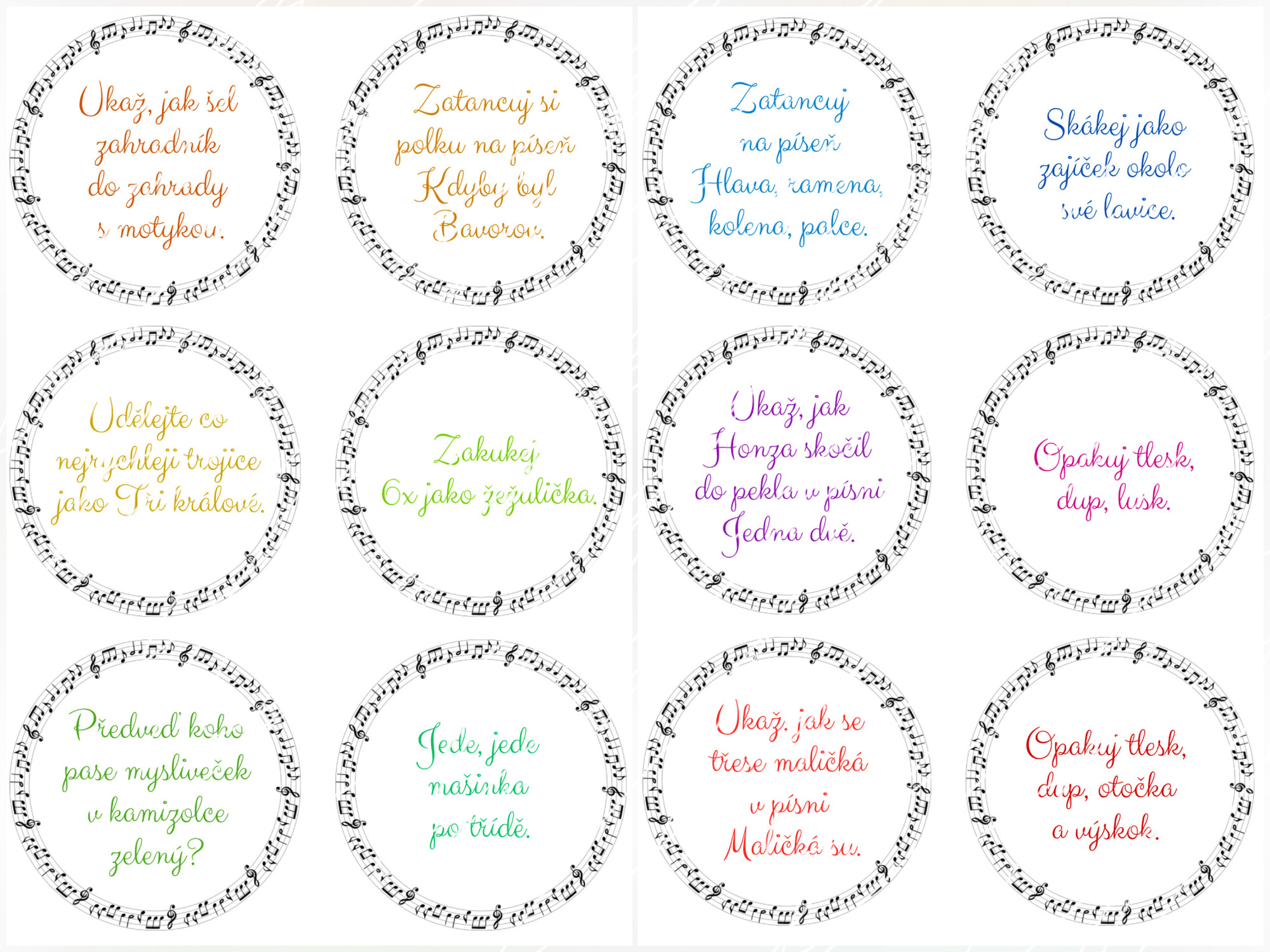 Soubor obsahuje 30 krátkých, hravých aktivit (tzv. brain breaks) vytvořených na míru pro hodiny hudební výchovy na 1. stupni ZŠ. Skoro každá kartička je založena na známé české lidové písničce a aktivizuje děti během výuky – zapojují paměť, rytmus, pohyb i logické myšlení.
