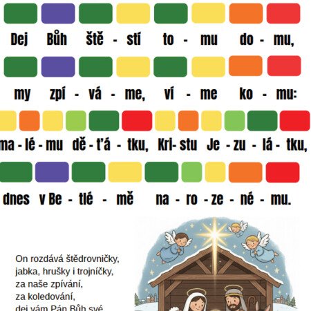 U každé písničky najdete barevný pracovní list (viz náhled), pracovní list jako omalovánku, další se jmény not a poslední notová osnova s barevnými notami. Součástí jsou i hudební ukázky. První je pouze melodie, druhá doprovod k písničce, aby se mohlo hrát i v místnostech, kde není klavír, kytara.
