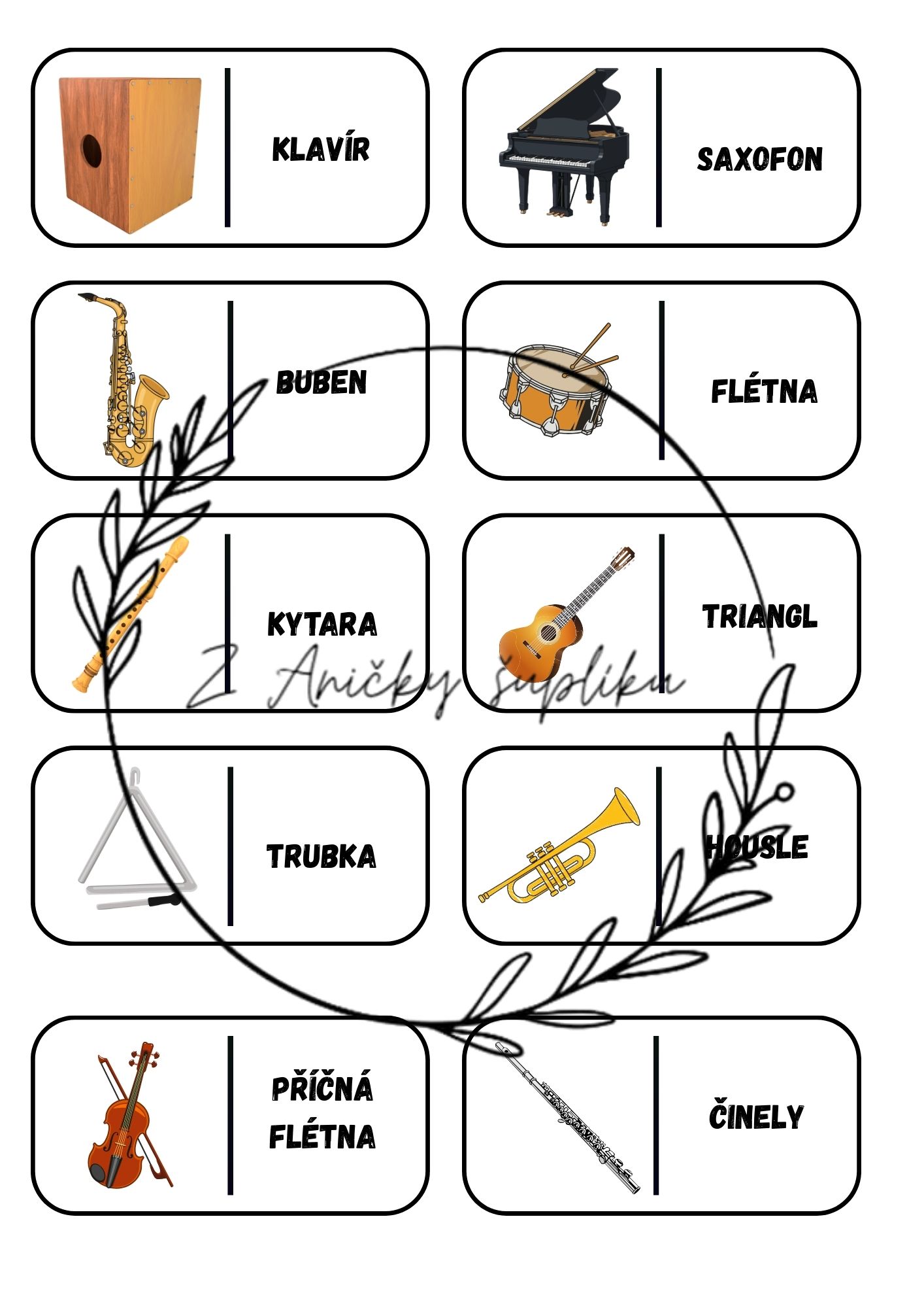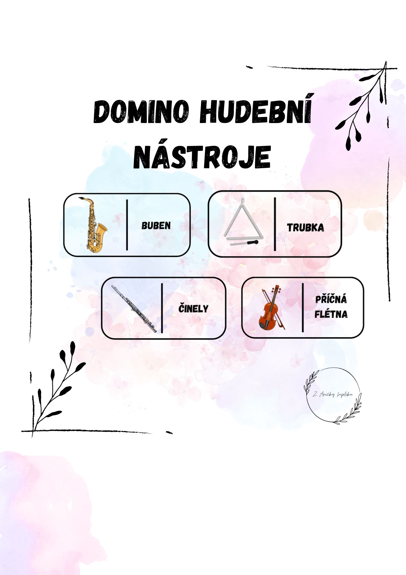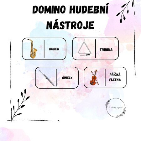 Domino hudební nástroje je skvělá pomůcka do hudební výchovy pro seznámení a upevnění názvů hudebních nástrojů. Žáci si při hře přirozeně procvičují jejich rozpoznávání a rozvíjejí slovní zásobu i pozornost. Aktivita podporuje spolupráci ve třídě a zpestří hodiny hudební výchovy hravou formou. Materiál obsahuje 24 karet i barevnou zadní stranu.