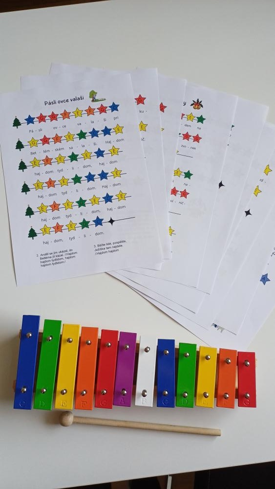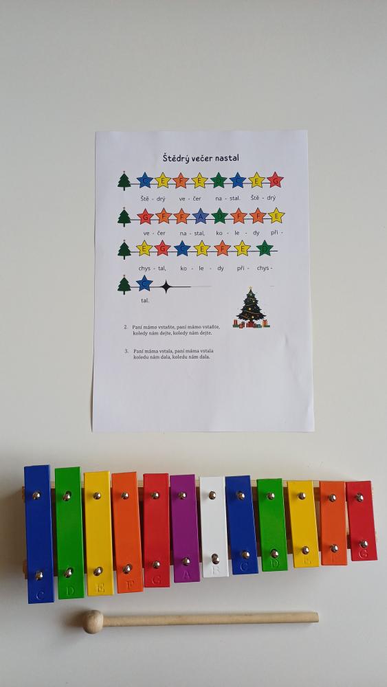 2. Hraní na xylofon nebo zvonkohru. Tyhle kouzelné barevné předlohy dětem pomohou v tom, na které kameny přesně mají hrát. Obsahem jsou nejznámější vánoční písně.